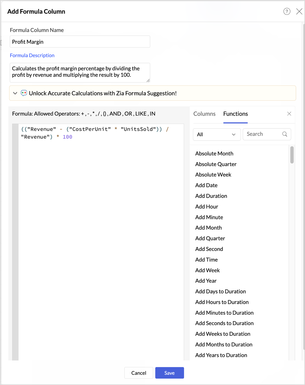 Zoho Analytics also provides an easy and convenient way to add formula columns which are based on a limited set of widely used functions.