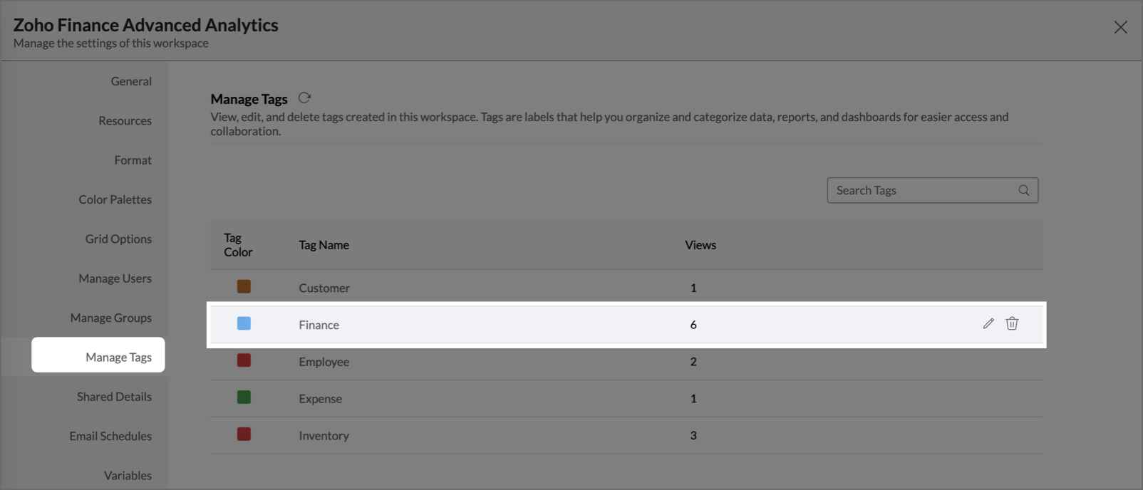 Zoho Analytics provides a centralized Manage Tags section that allows you to control all tags within a workspace from a single location, rather than editing views individually.