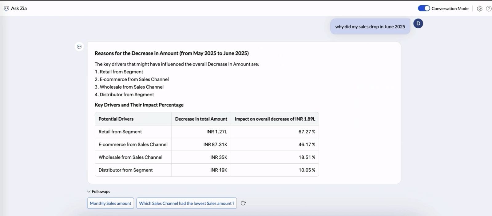 The conversational interface in Ask Zia allows users to explore data using simple language. It offers a closer lens into what has happened, why it happened, and what’s likely to happen along with recommendations to guide your next steps.