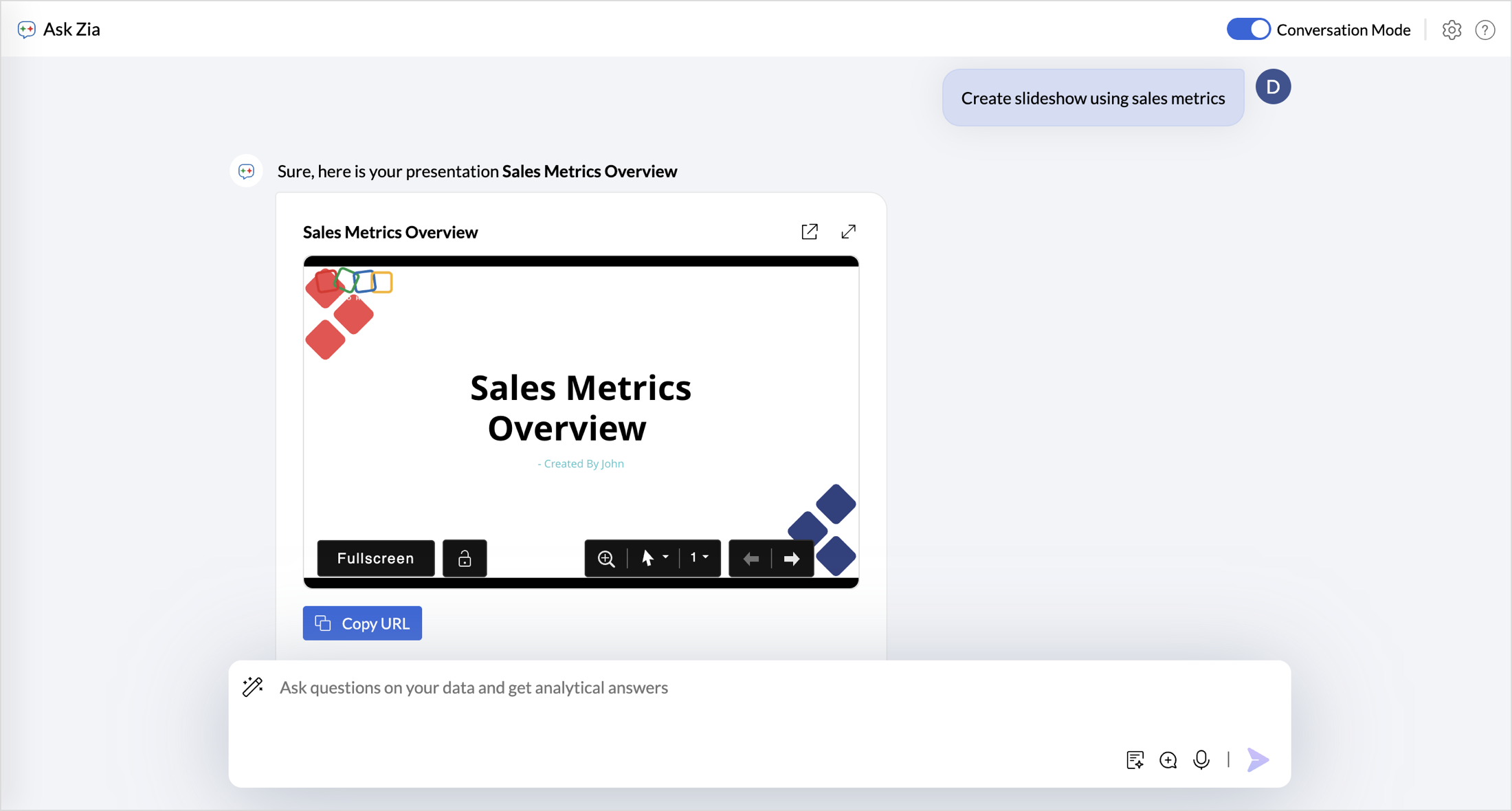 Convert reports and dashboards into compelling, narrative-driven slideshows with Ask Zia.