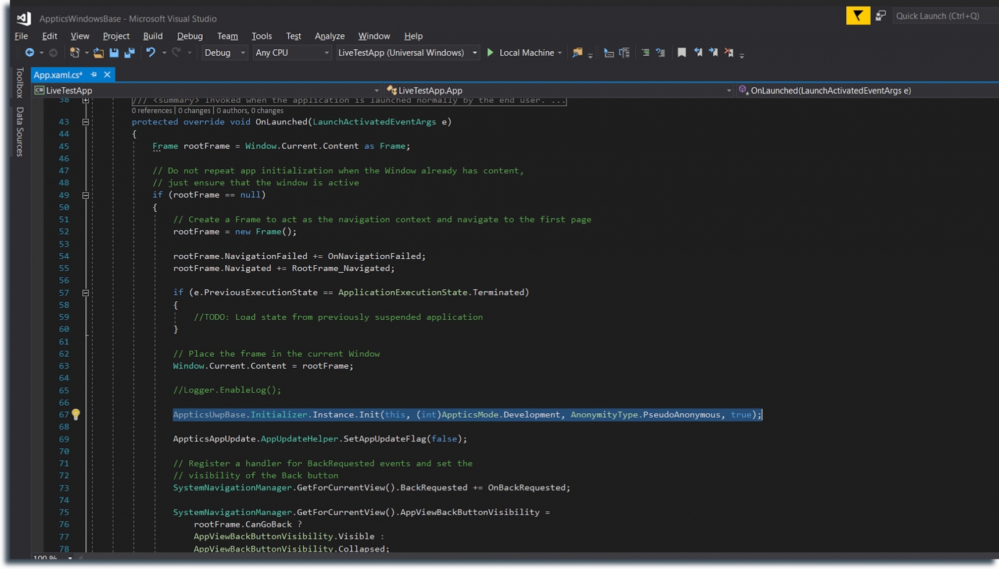 - Open your app App.xaml.cs file and go to OnLaunched event (create if not), and add the following line of code, below your frame register.