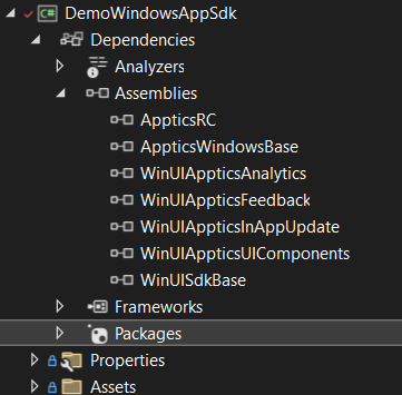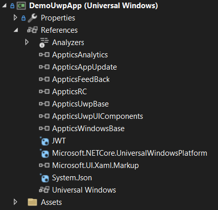 - Add more references like "WinUIAppticsInAppUpdate.dll", if you want to use the in-app update feature.