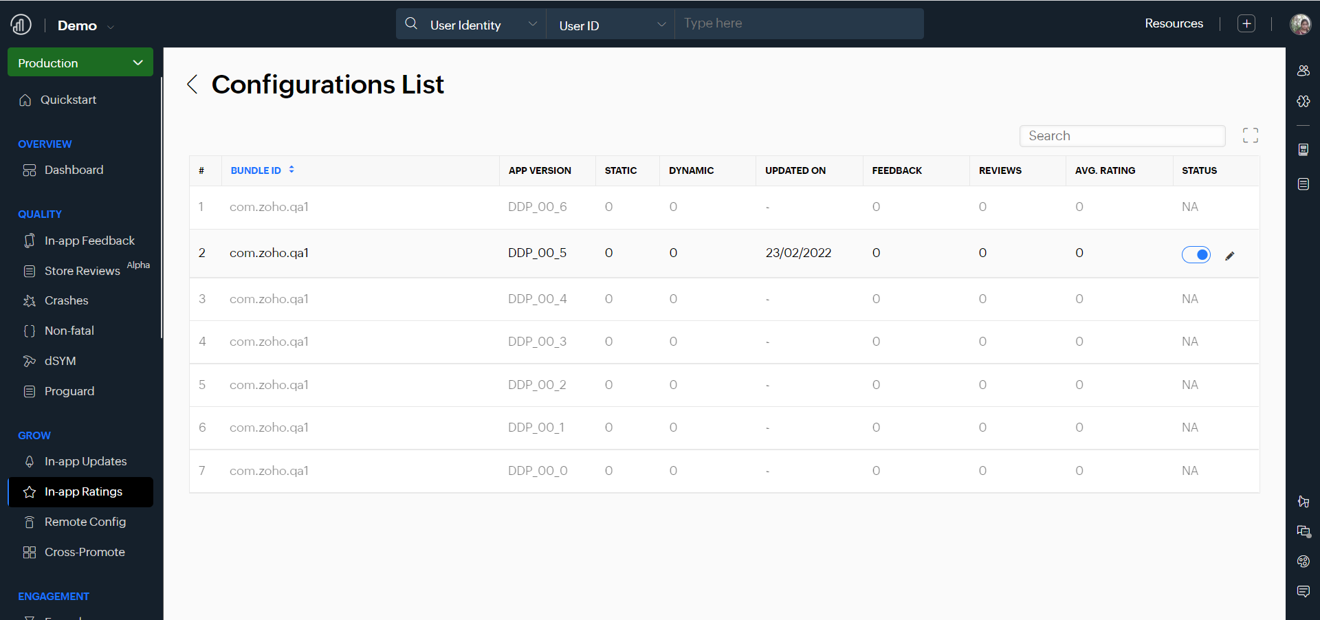 - In the Status column, you can enable/disable the In-app Ratings for the individual app version.