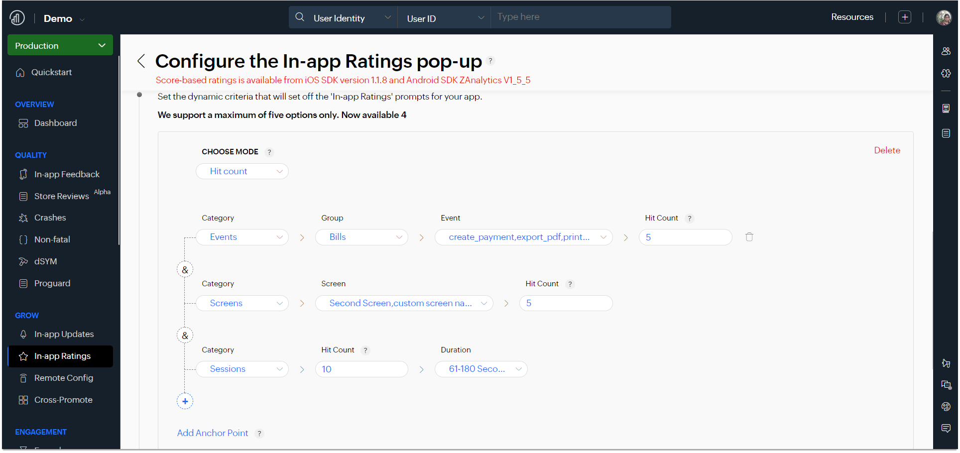 In the hit-based configuration, you define how many times a user has to trigger an event, visit a screen, or complete a session. When it satisfies the configured hit count, you show the rating pop-up.