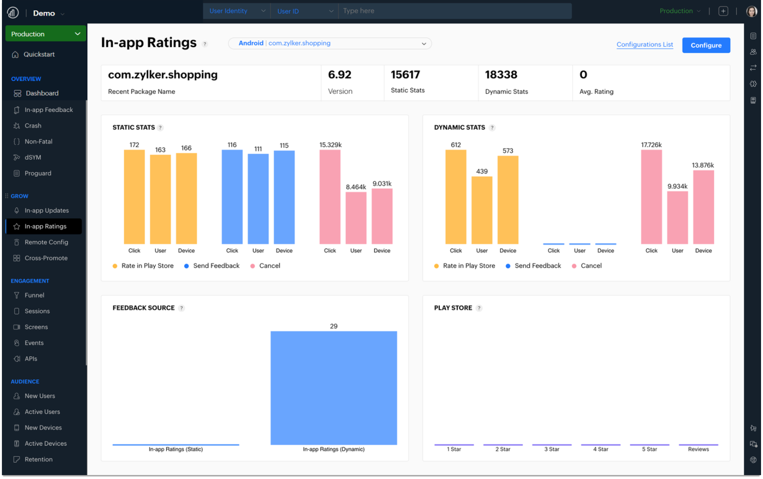 - Once you save the configuration, you will be redirected to the In-app rating dashboard.
