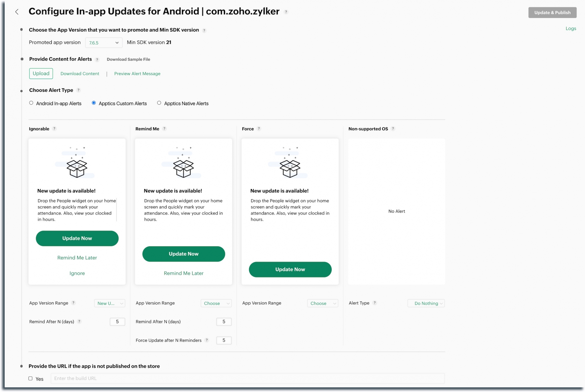 You can configure in-app updates for iOS, Android, and other platforms from the console. Apptics also supports Google's in-app updates for Android apps running on OS level 5.0 and above.