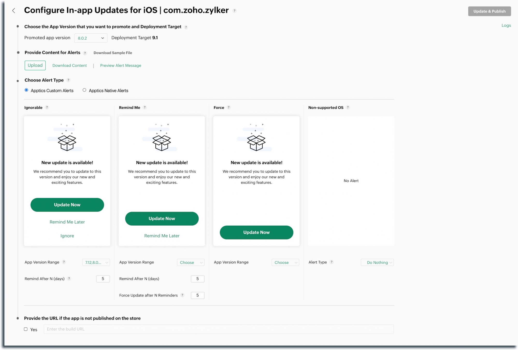 - In-app updates are distributed via the App Store. If you wish to distribute your in-app updates via any custom URL, click the Yes box and provide the Store URL.