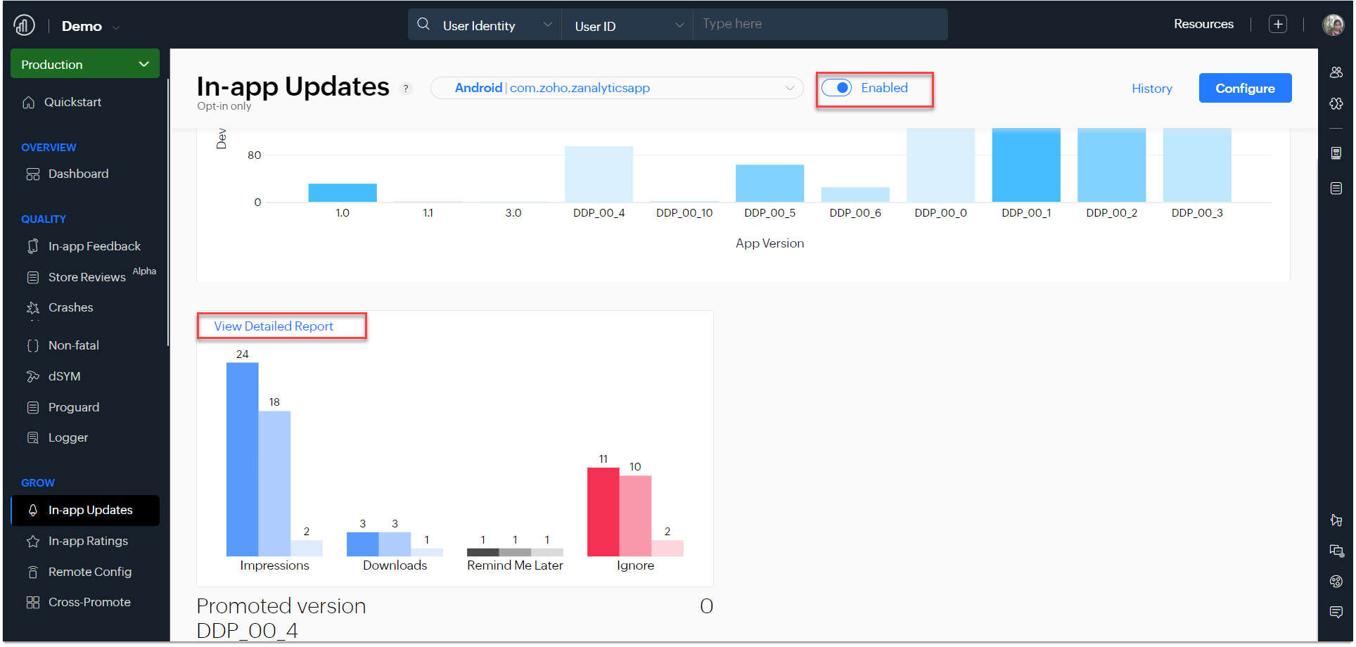 - Once the configuration is saved, you will be redirected to the In-app updates dashboard.