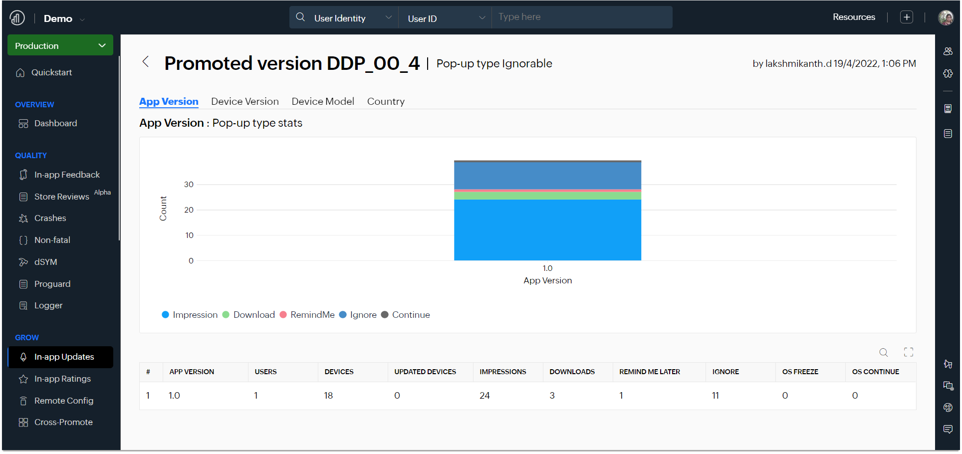 - Click on the individual tabs to drill down details based on the app version, device version, device model, and country. View details about devices, updated devices, impressions, downloads, remind me later, ignore, OS freeze, and OS continue.