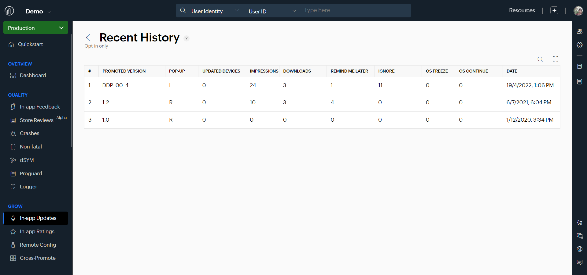 The In-app Updates Dashboard shows stats about the update alerts you have configured for each Bundle id or Package name.