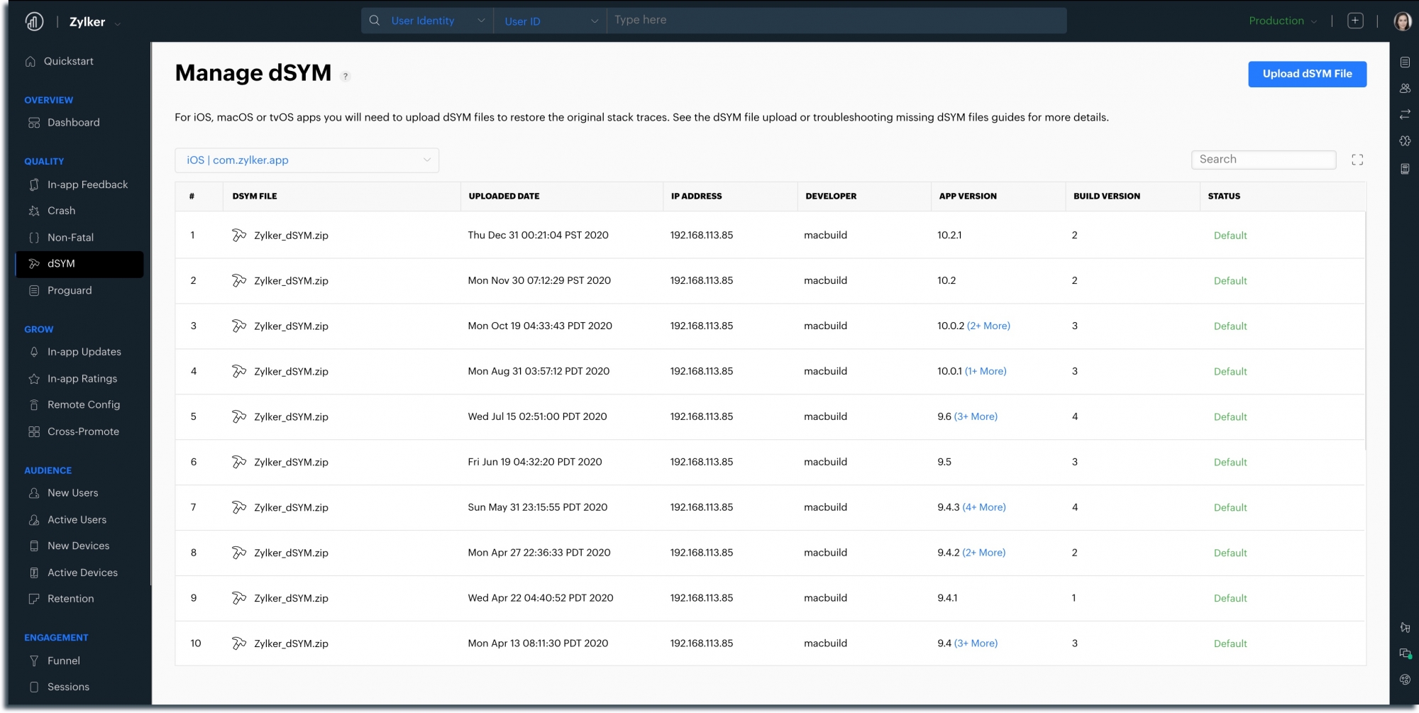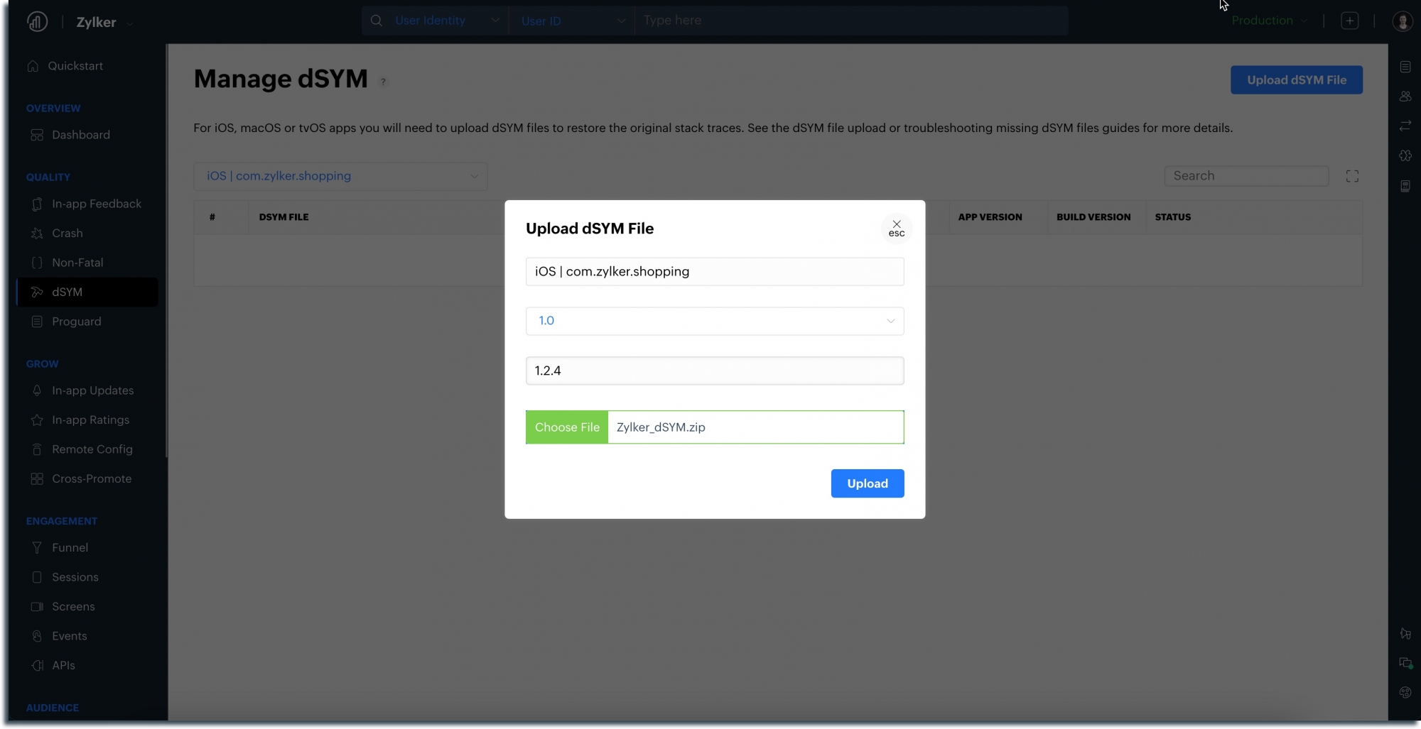 - Click Upload and the new dSYM file will be uploaded.