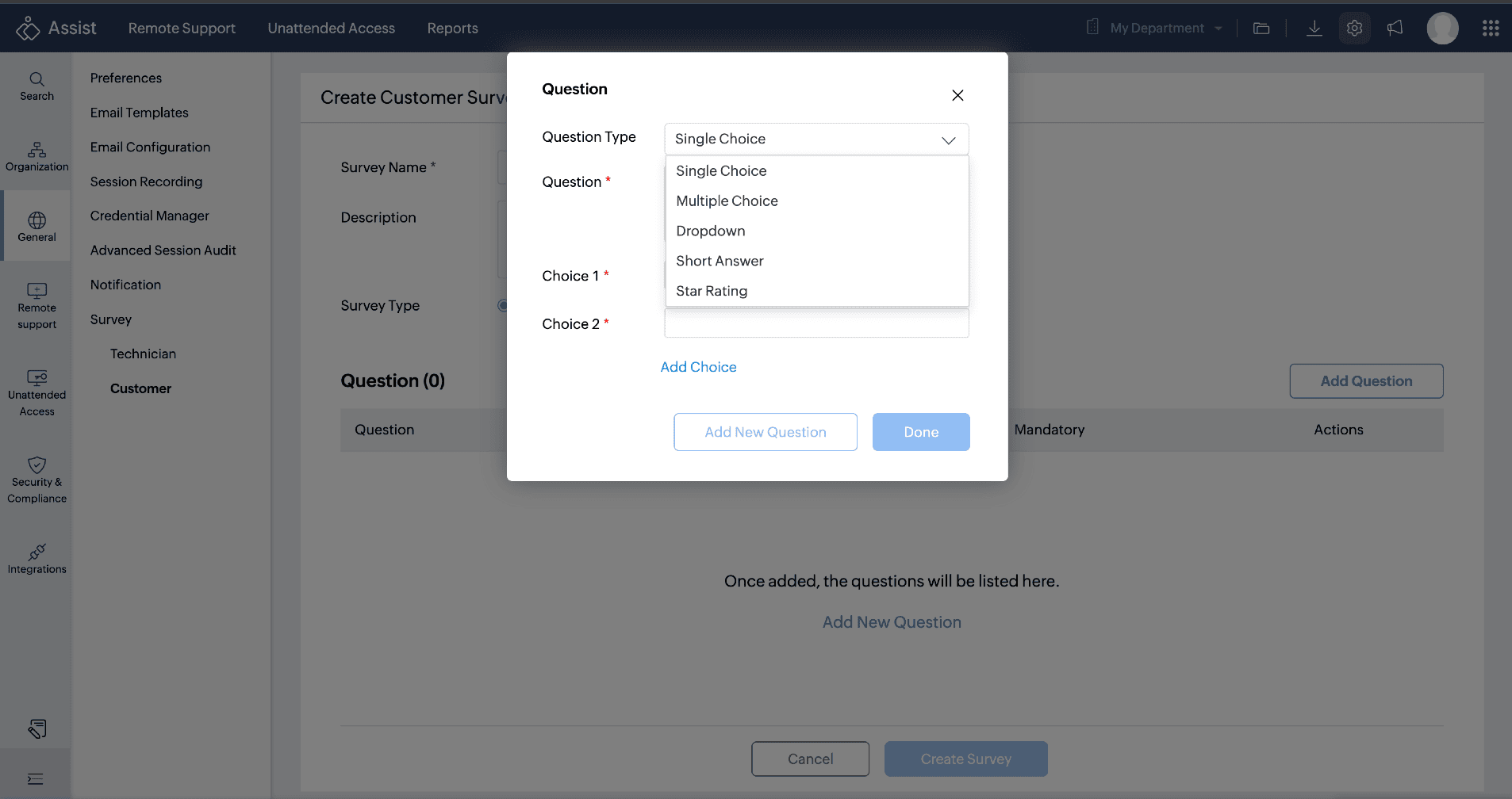 - Once you choose Customer Survey, click Add Question and choose from the various question types, such as single choice, multiple choice, short answer, drop-down, or star rating. Enter the question and provide the appropriate choices.