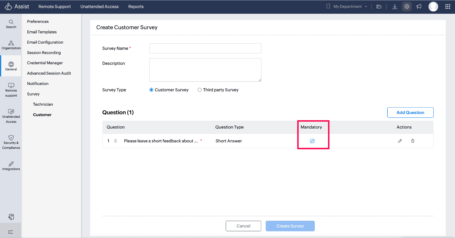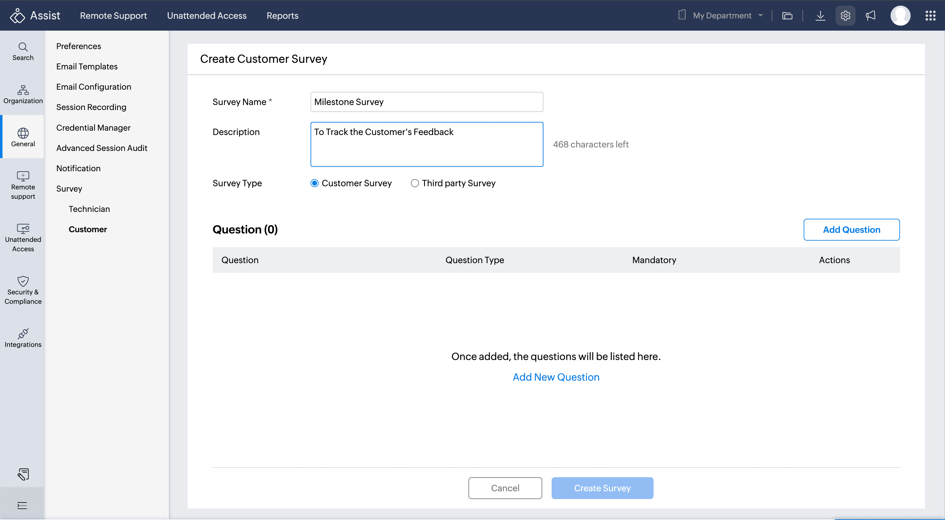 - Once questions are added, click Create Survey. Customer surveys can also be created by department.