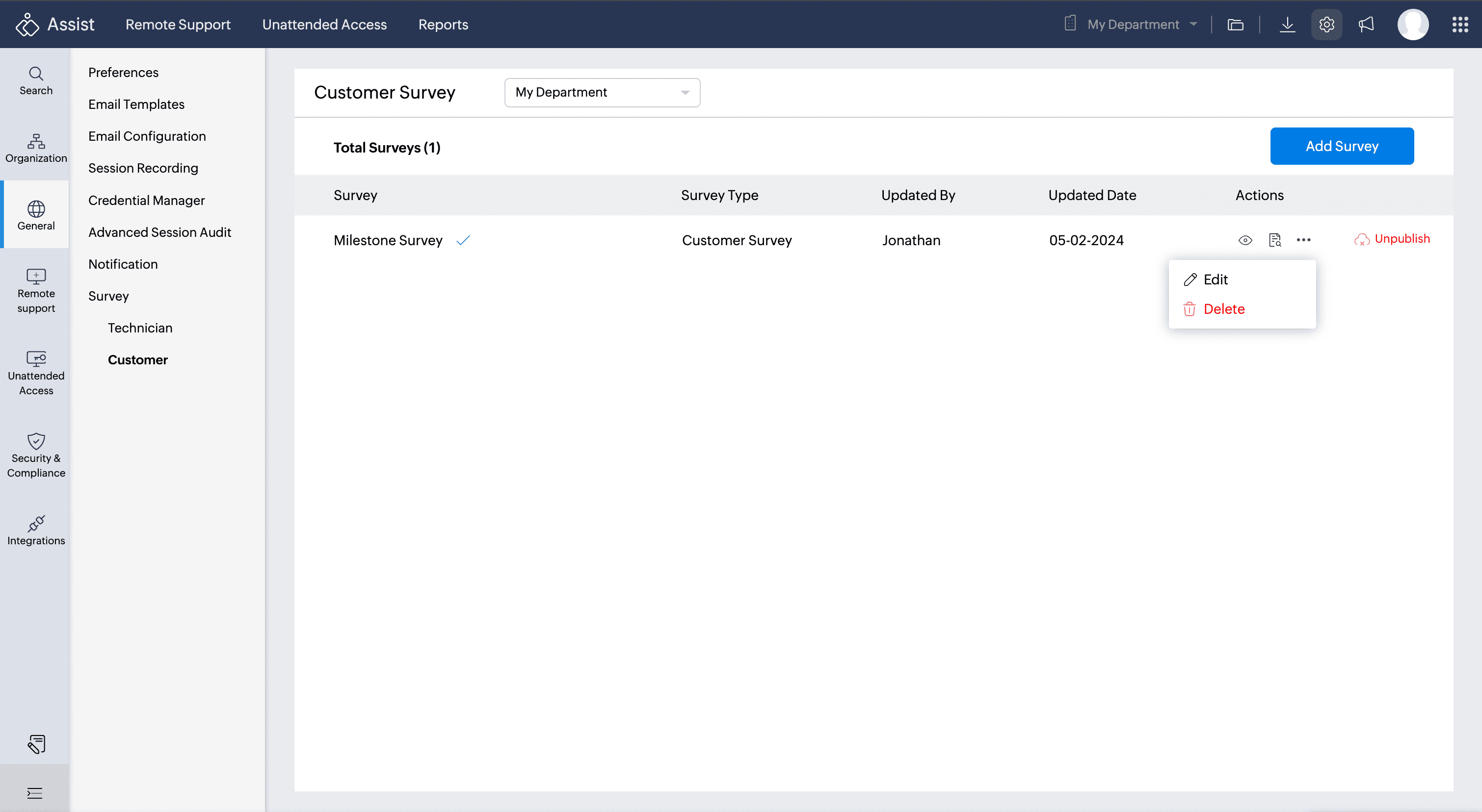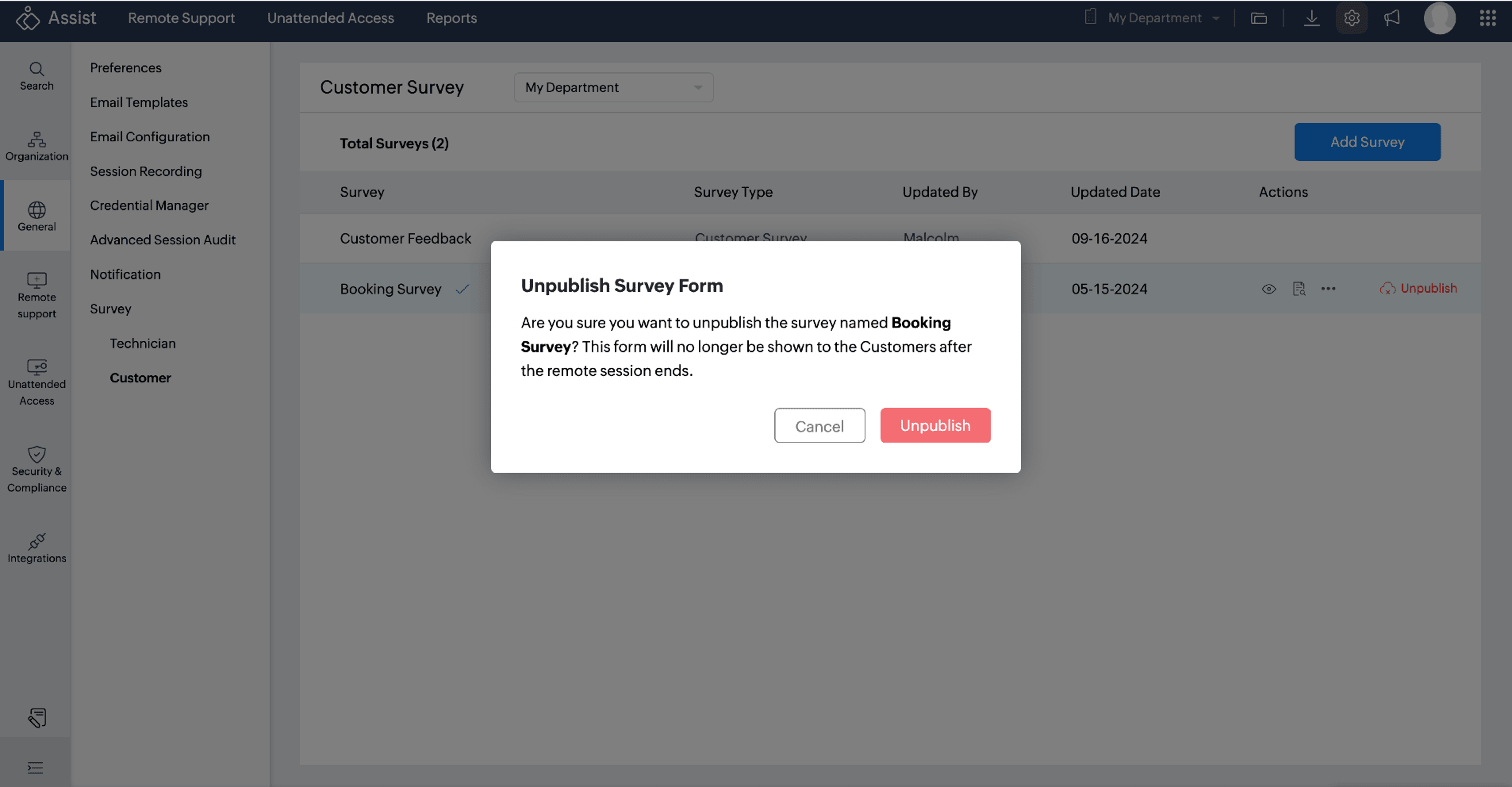 - Click Unpublish to unpublish the survey.