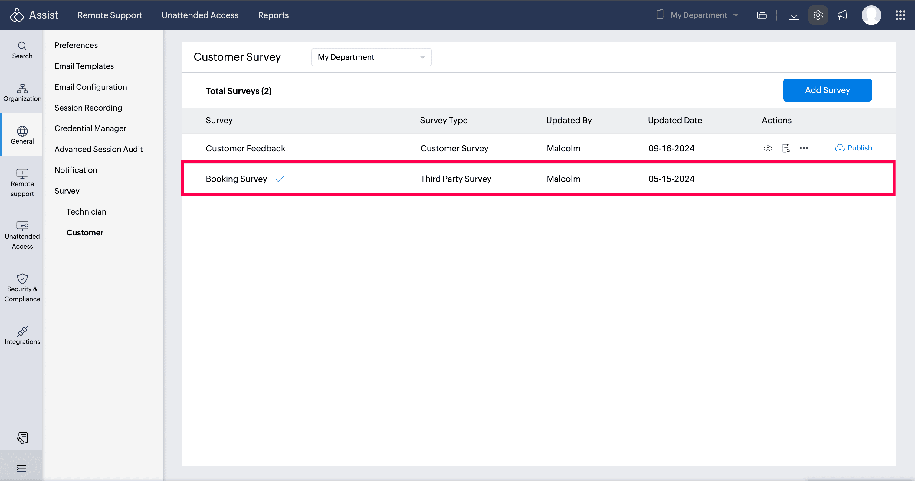 - After creation, click Publish to make the survey available for customers at the end of each session.