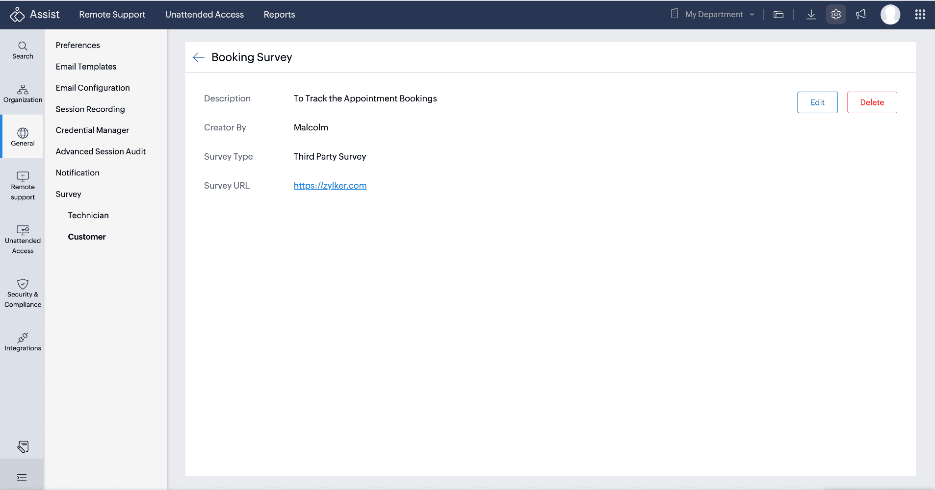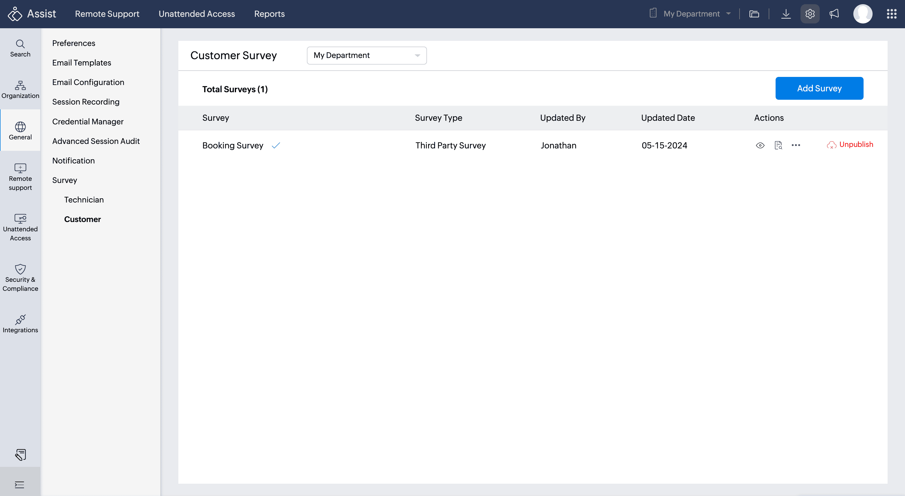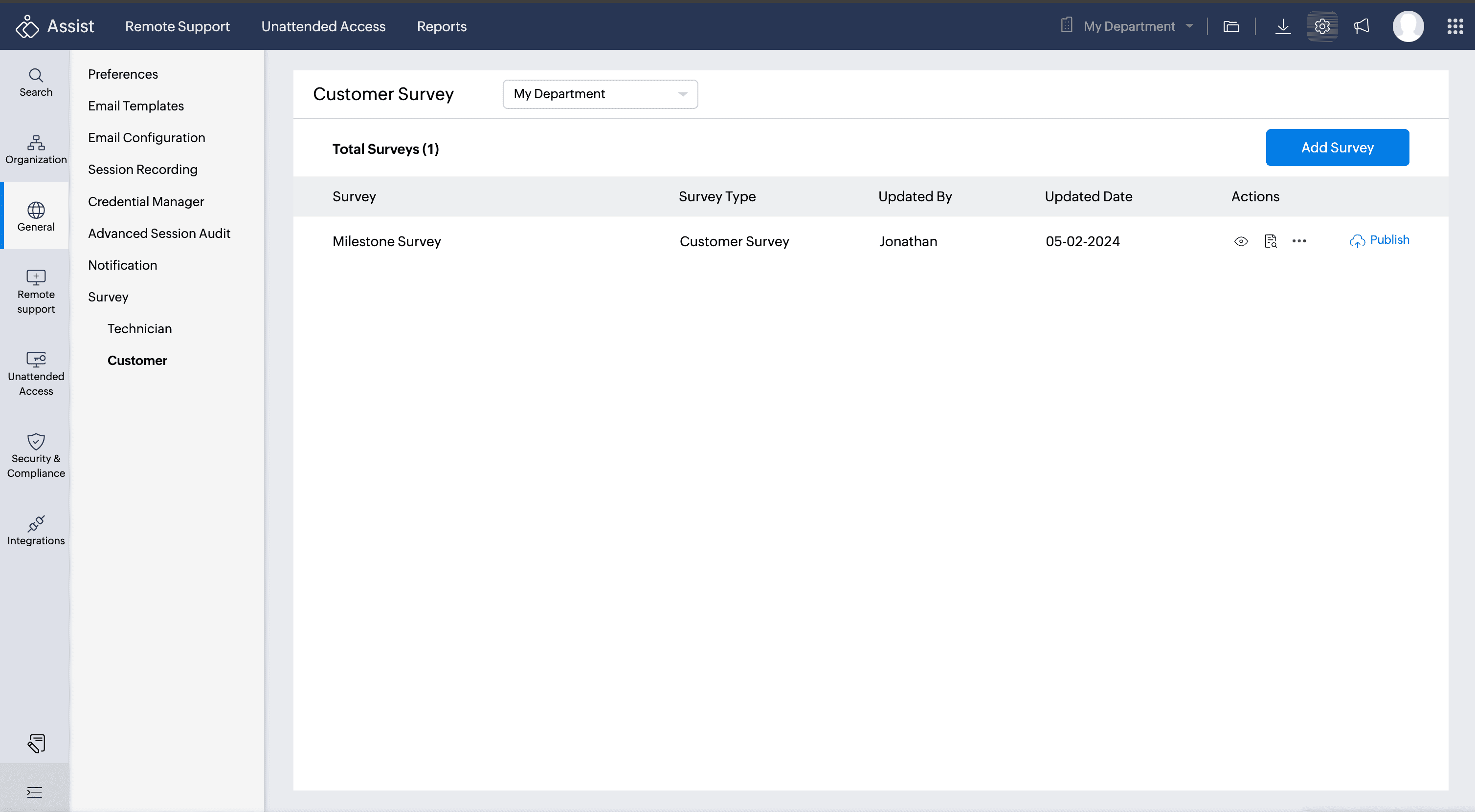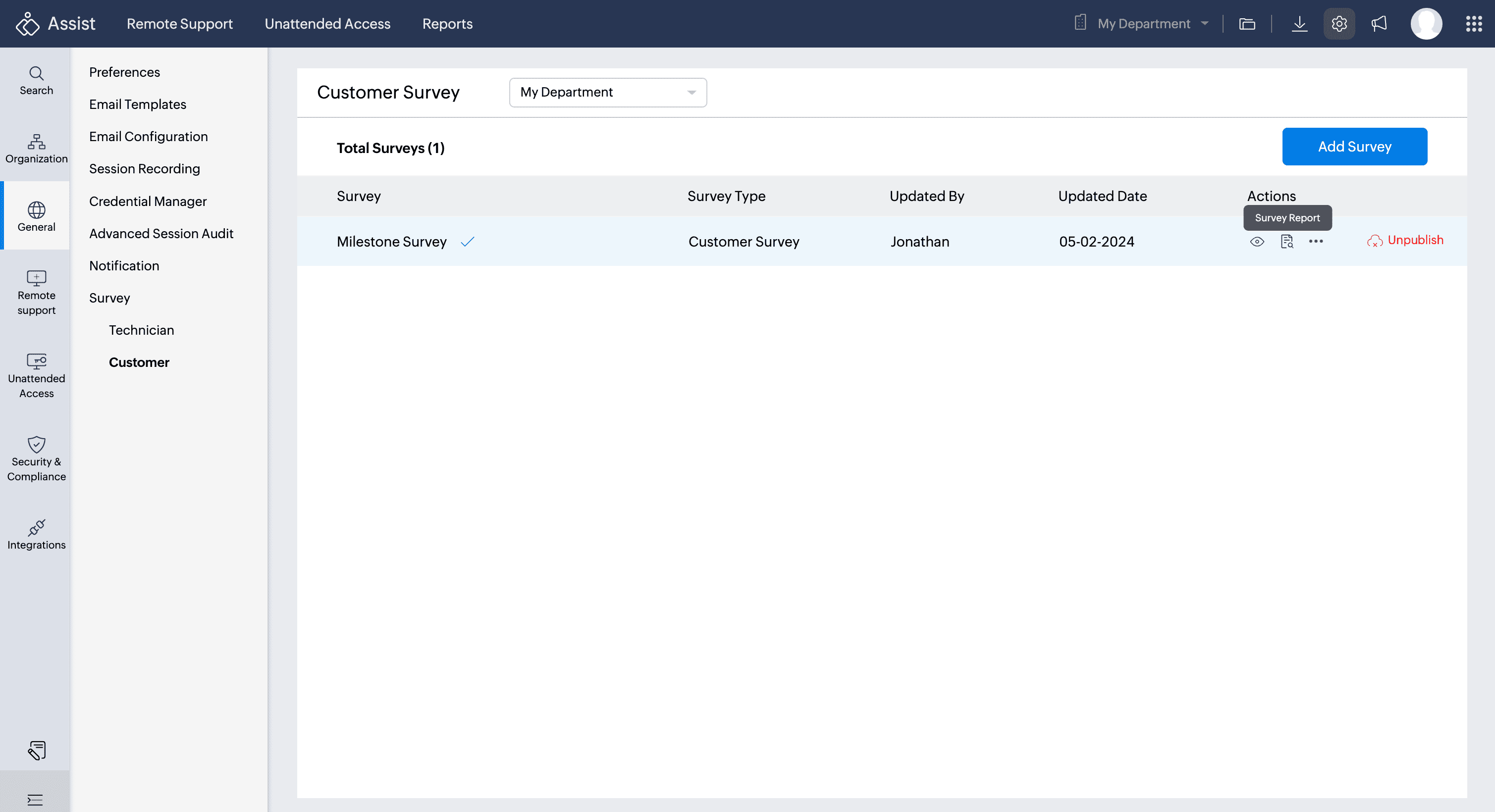 The Customer Survey feature enables customers to share feedback on remote sessions. After each session, they'll be prompted to fill out a customized or a third-party survey, providing insights about their remote experience. These responses can be compiled into survey reports for detailed analysis at a later stage.