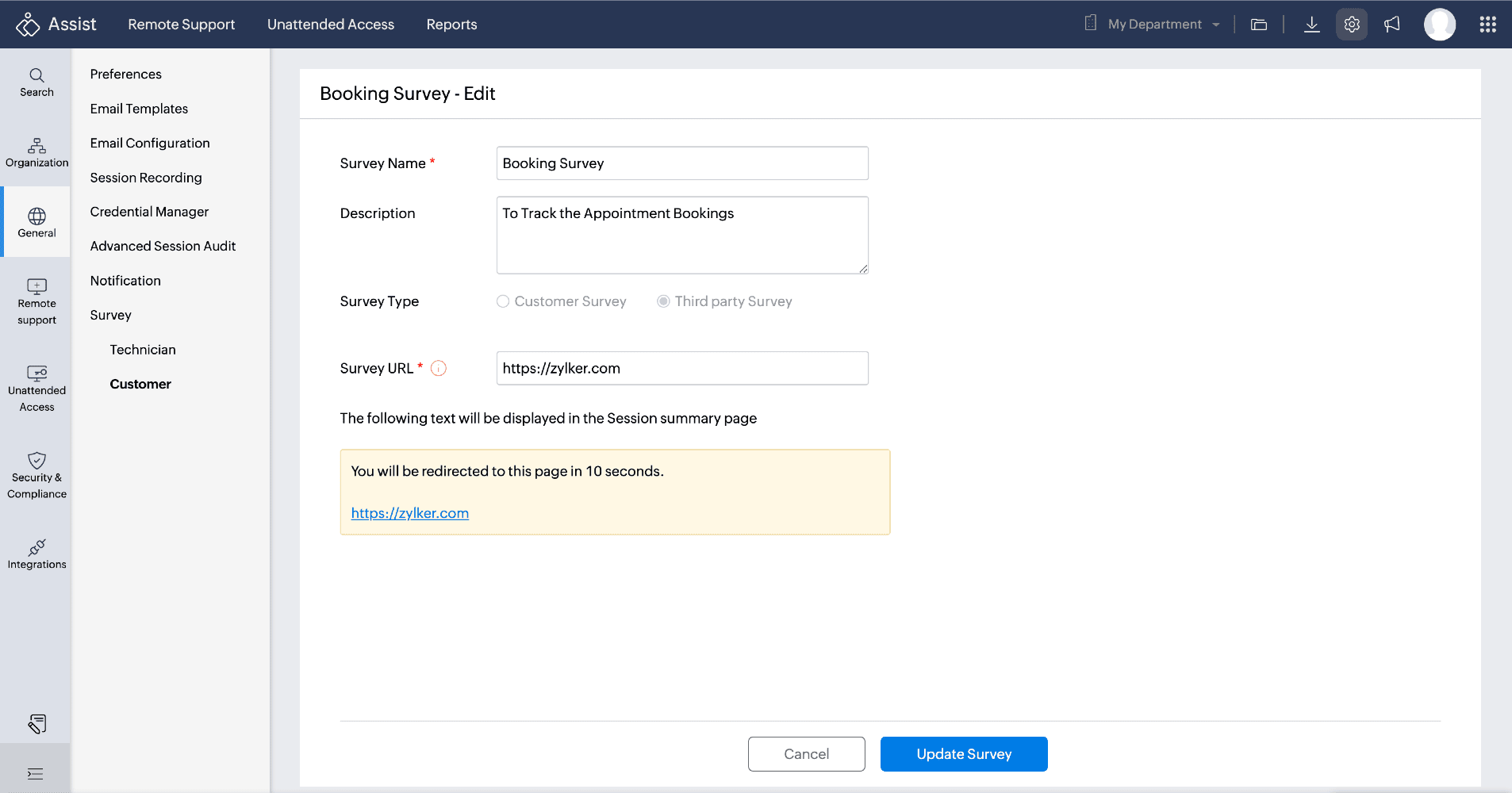 You can also choose the Third-Party Survey option to redirect your customers to a custom survey or webpage that aligns with your organizational preferences once the session ends.