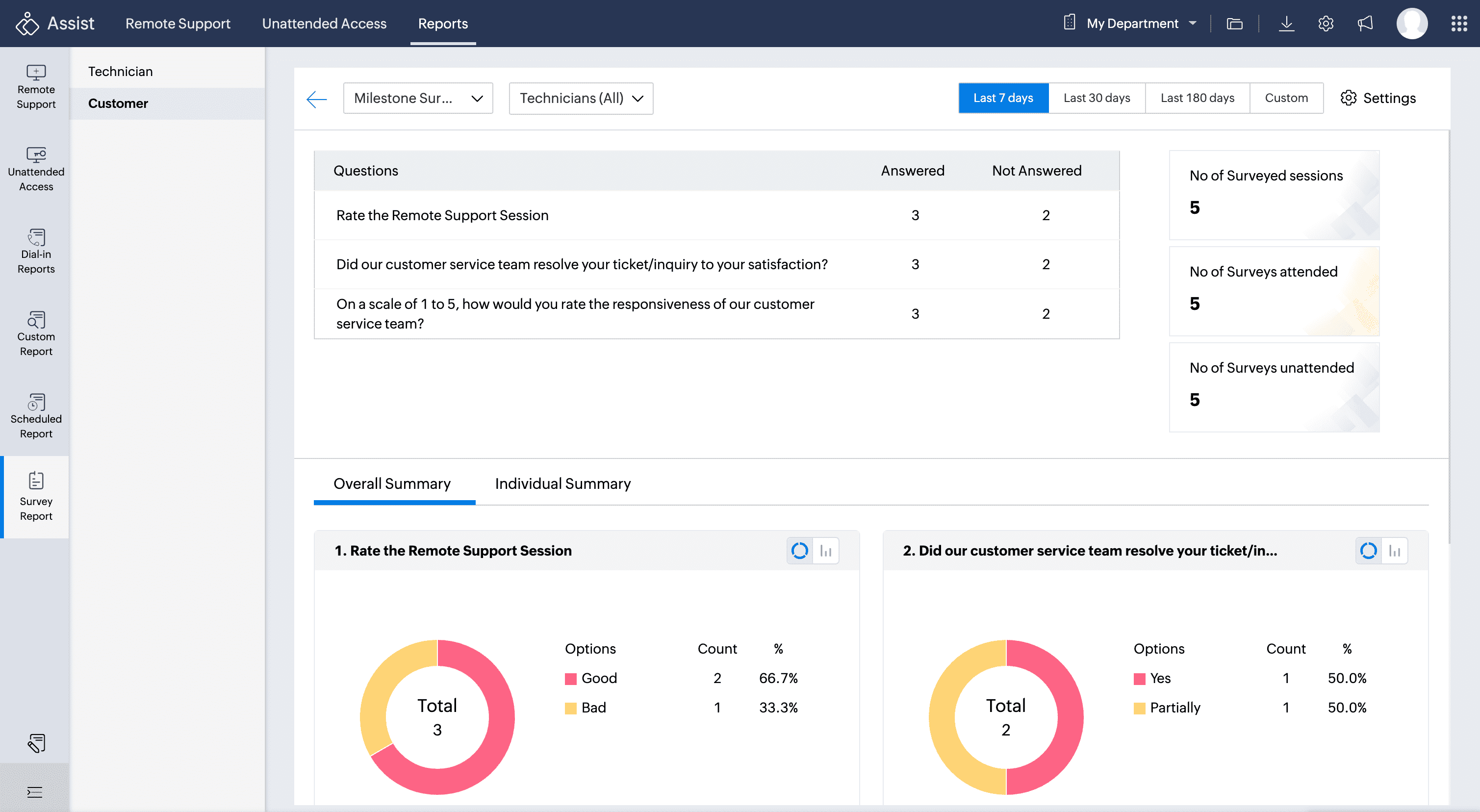 - The Survey Report overview includes details like Technicians, conducted sessions, sessions with surveys, and survey responses.