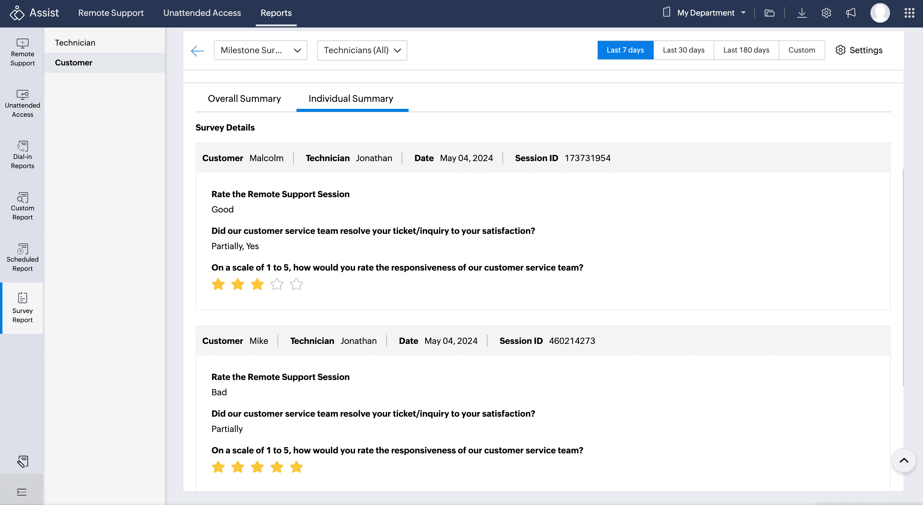 - Select Individual summary for detailed individual customer survey responses.