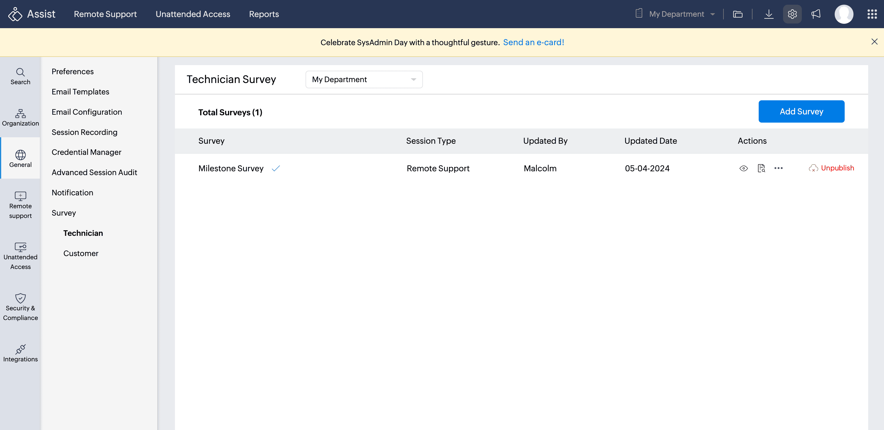 - After creation, click Publish to publish the survey to make it available for technicians at the end of each session.