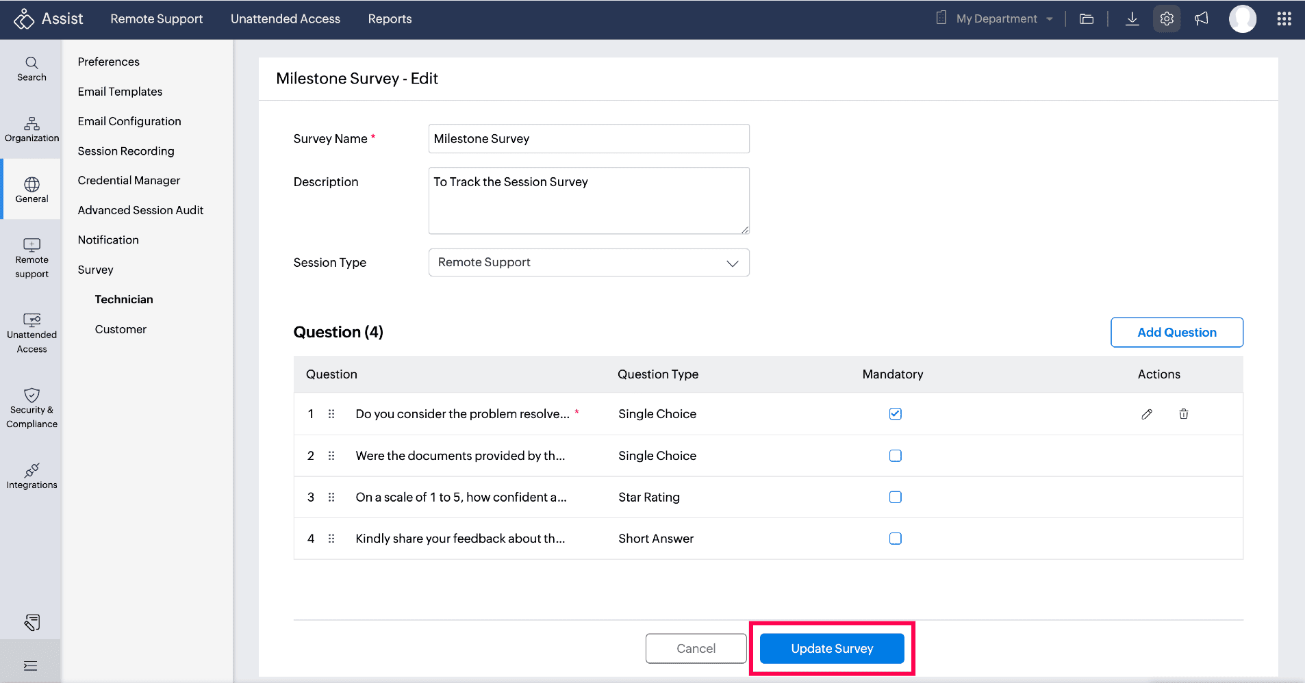 - You can now update the Survey name, session type, description, mandatory question preferences and click Update Survey to update the changes.