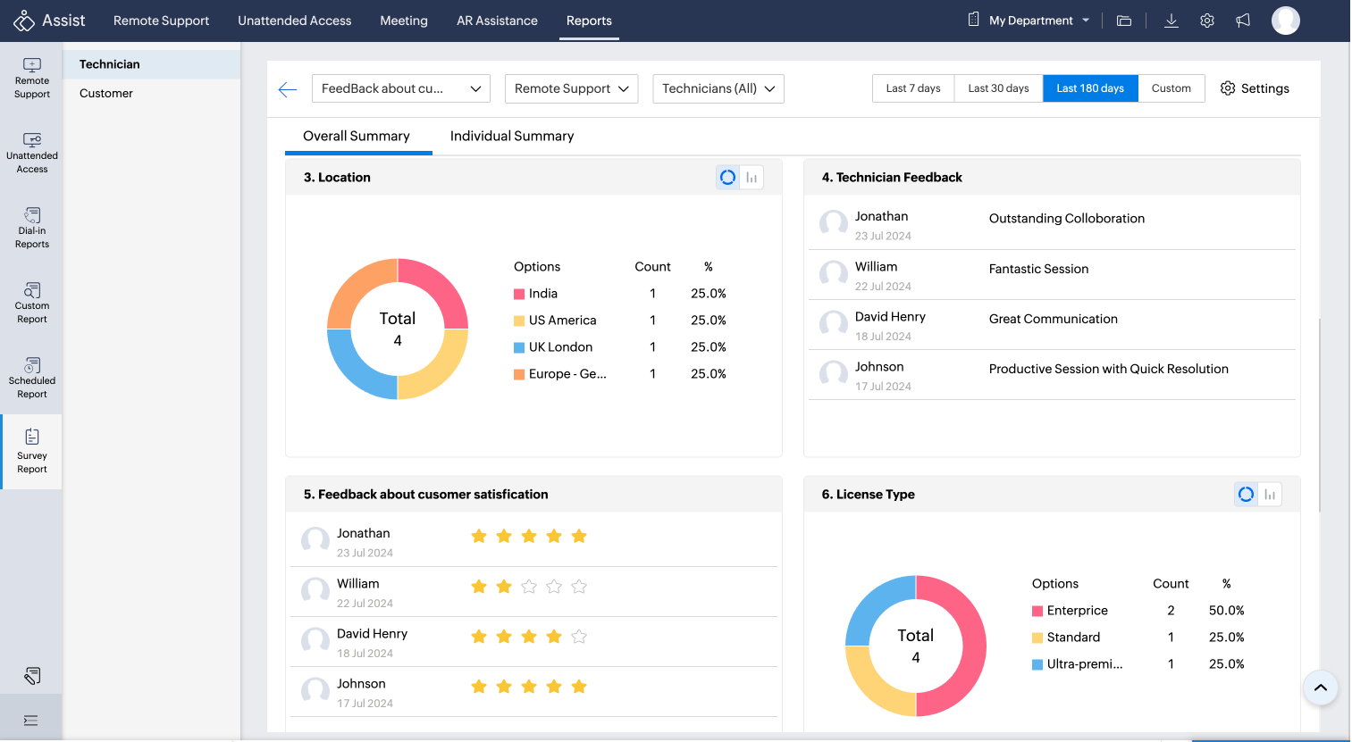 - The Survey Report overview includes details like Technicians, conducted sessions, sessions with surveys, and survey responses.