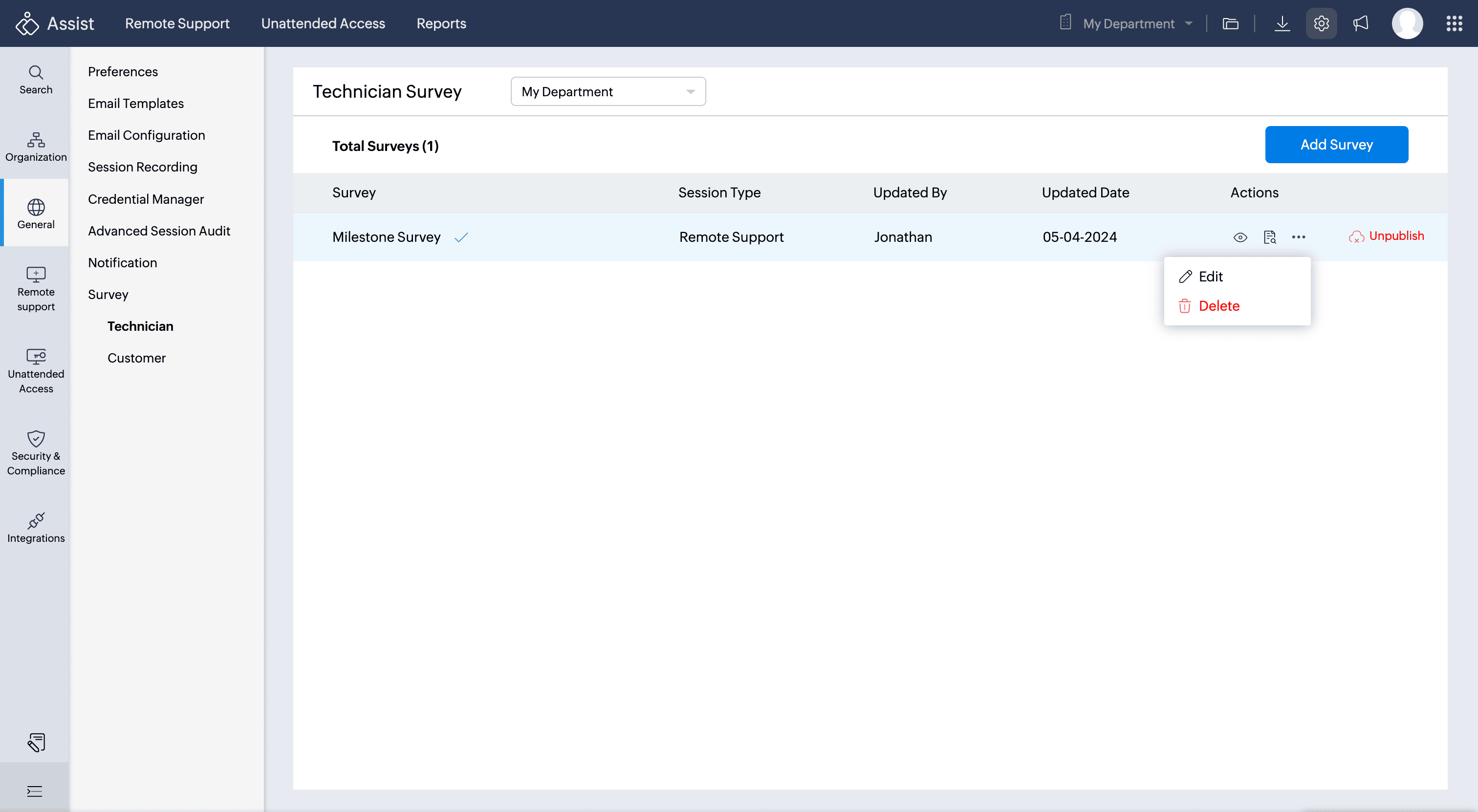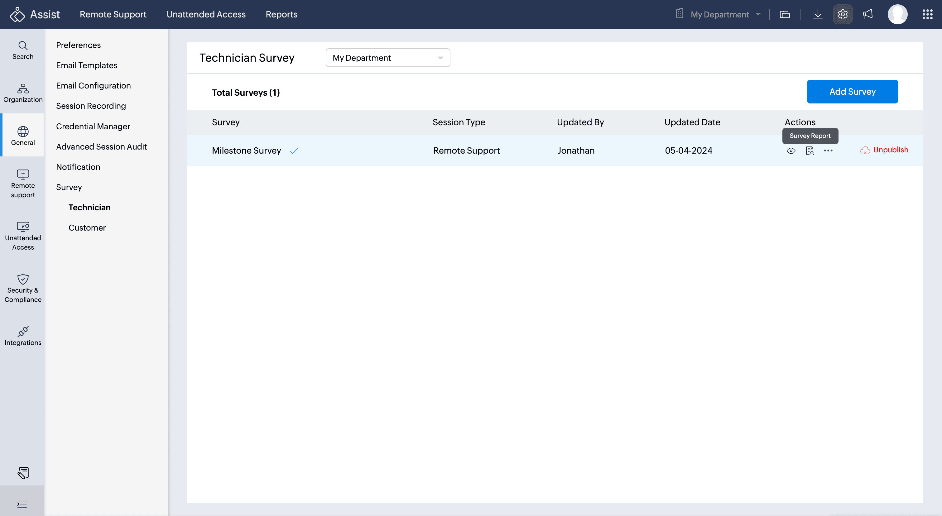 The Technician Survey feature allows technicians to share their valuable feedback, contributing to the improvement of remote service quality. After the completion of a remote session, technicians are prompted to fill out a survey form, providing insights into the remote assistance experience. These responses can be compiled into Survey Reports for detailed analysis at a later stage.