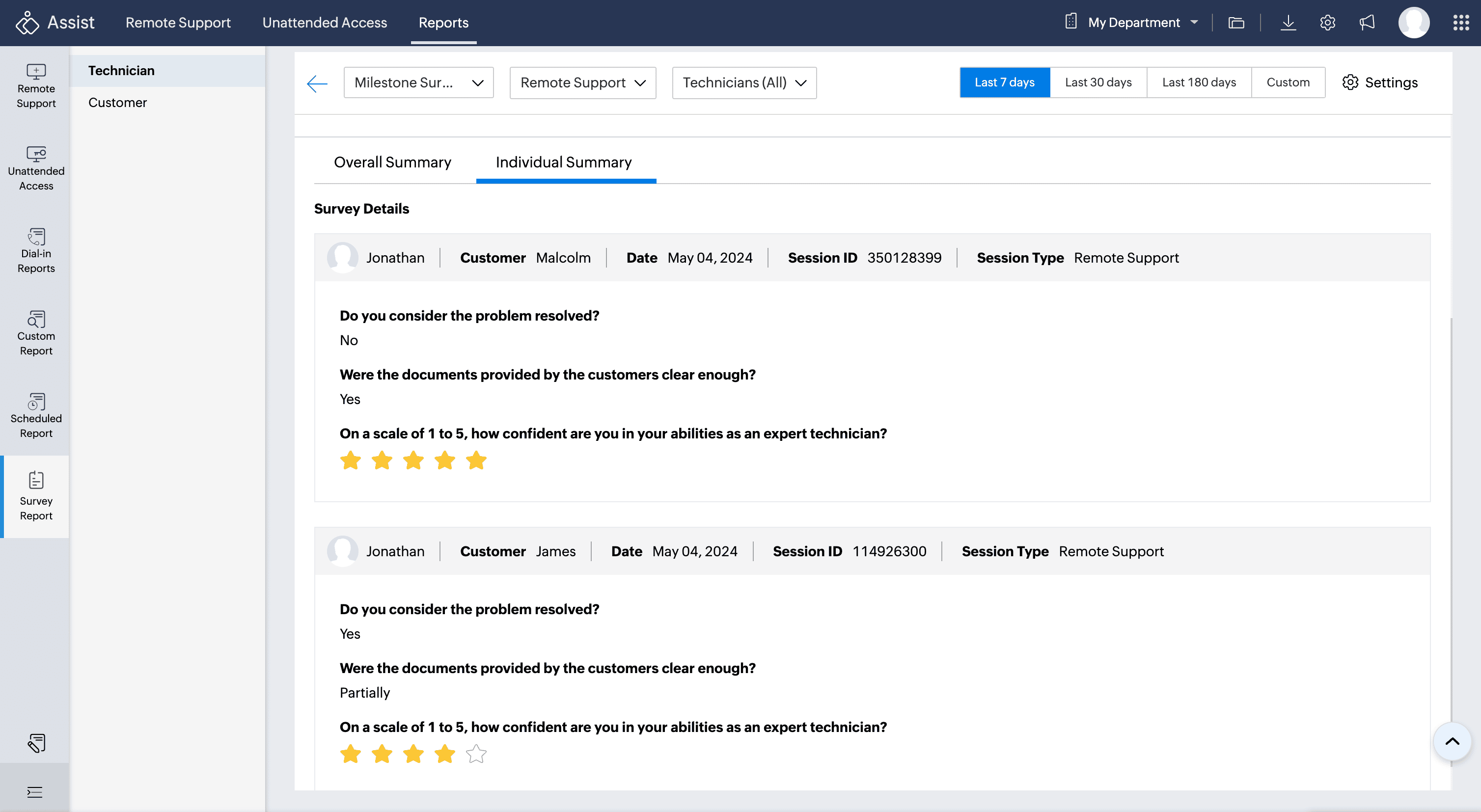 - Alternatively, you can access the survey reports by navigating to Reports > Survey Report > Technician. Reports can be filtered by Survey, Session Type, Technician type, and Time period.