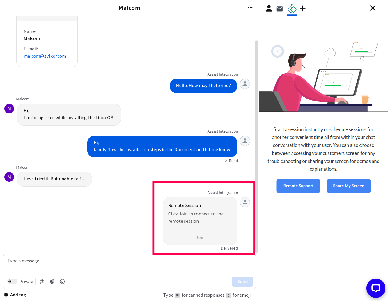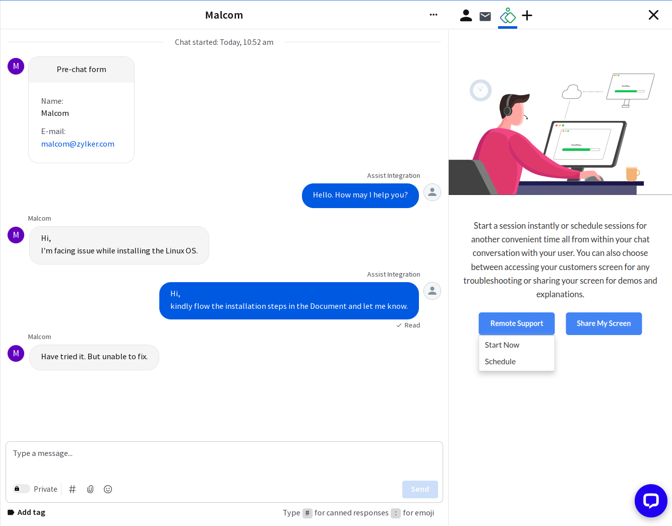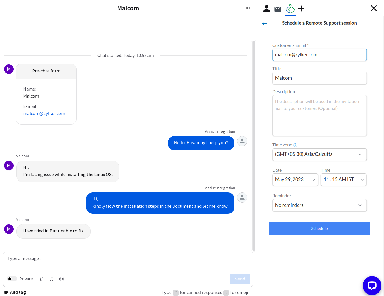 Start or schedule remote support and screen sharing sessions with Zoho Assist to access your customer's device and troubleshoot problems straight from your LiveChat conversations. Once a remote support session is complete, you can add notes to your LiveChat conversation.