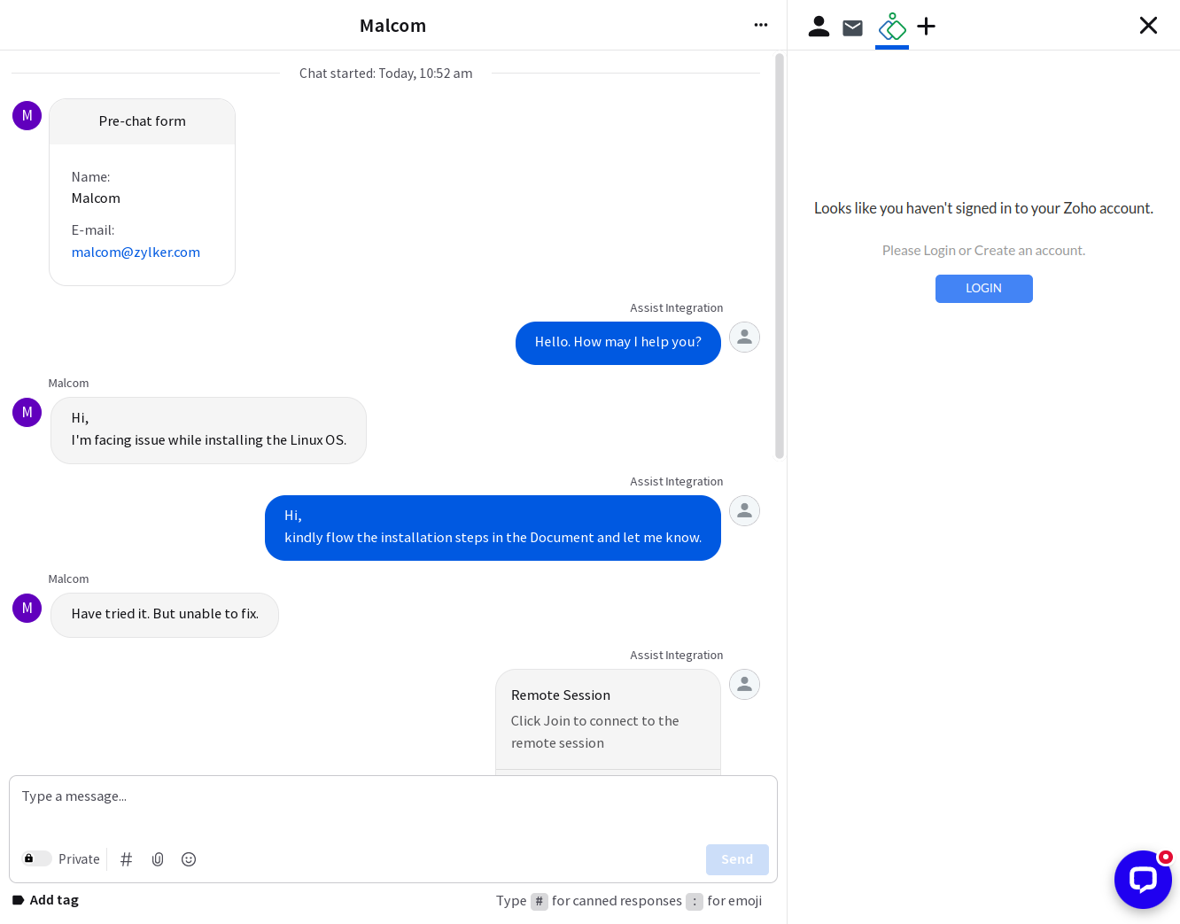 Open the LiveChat conversation and click Login to sign in to Zoho Assist (if not already signed in).