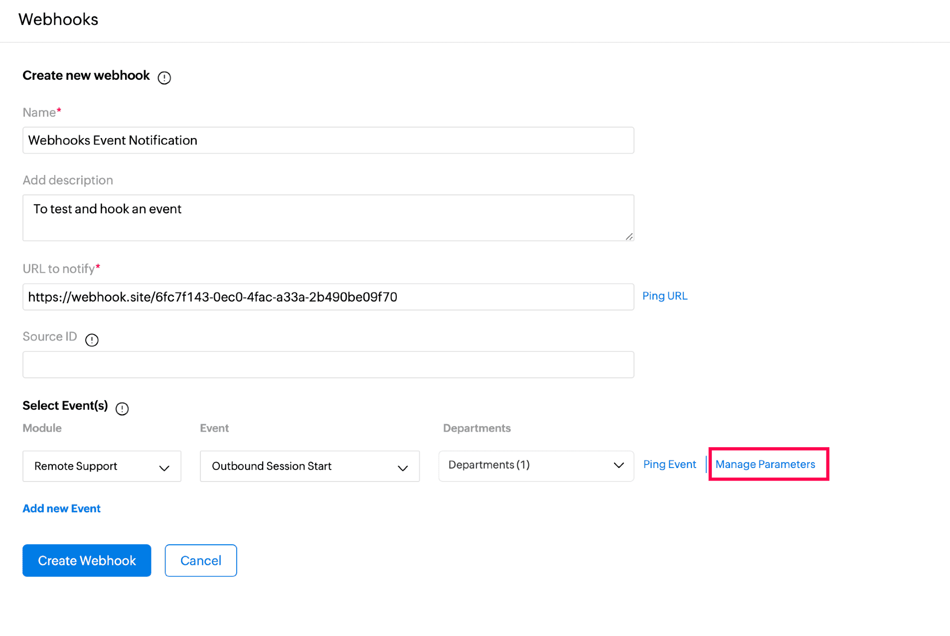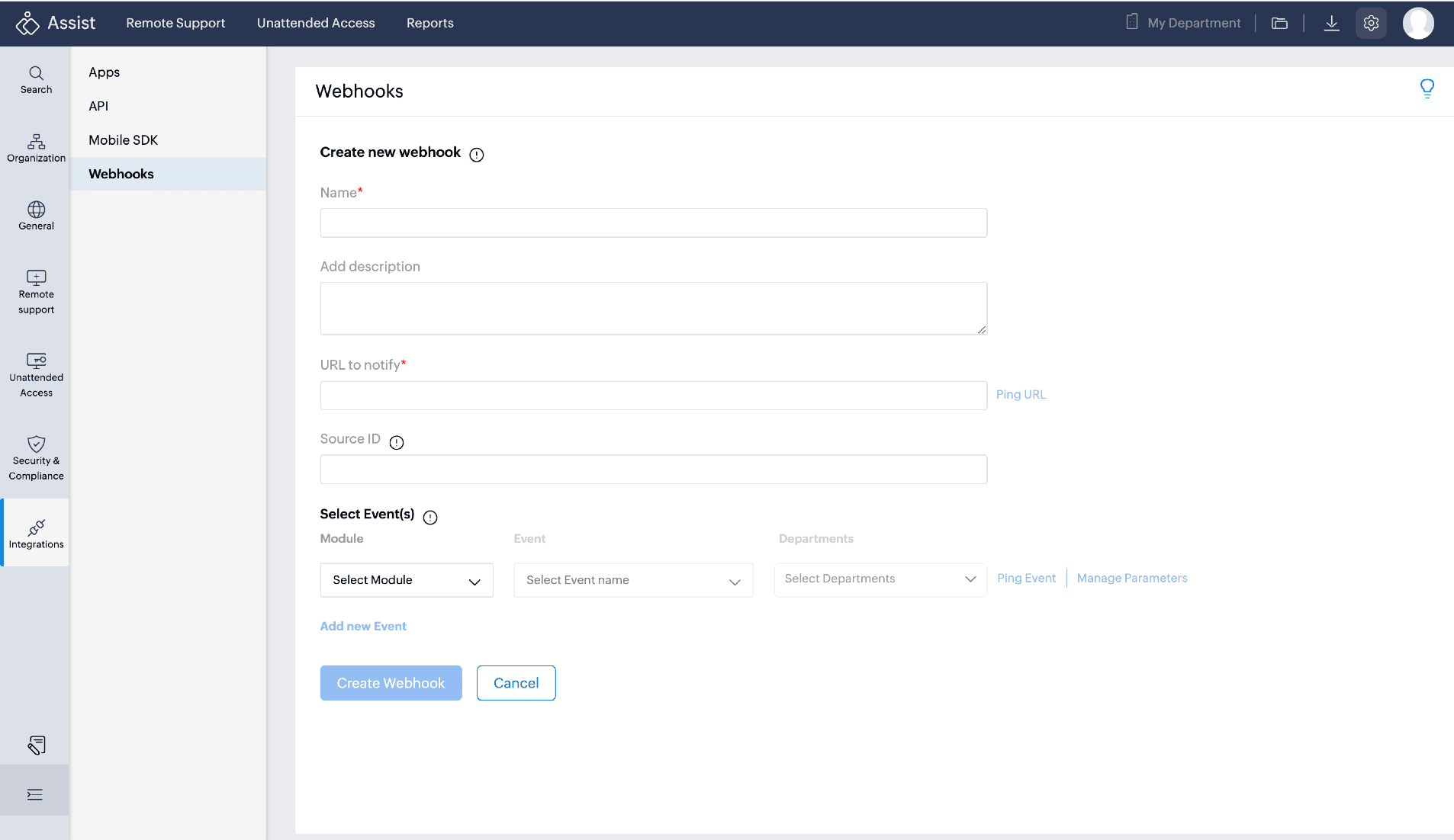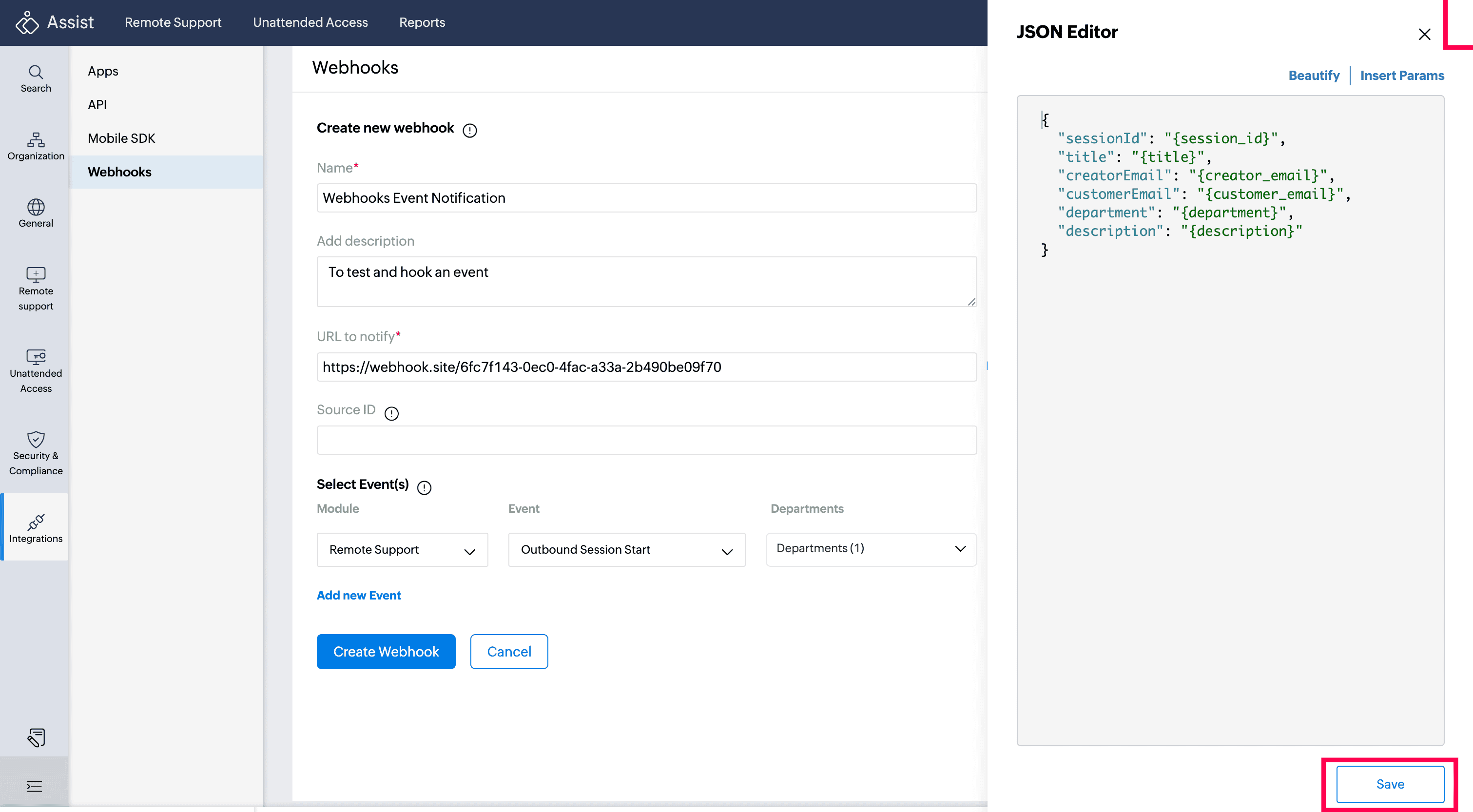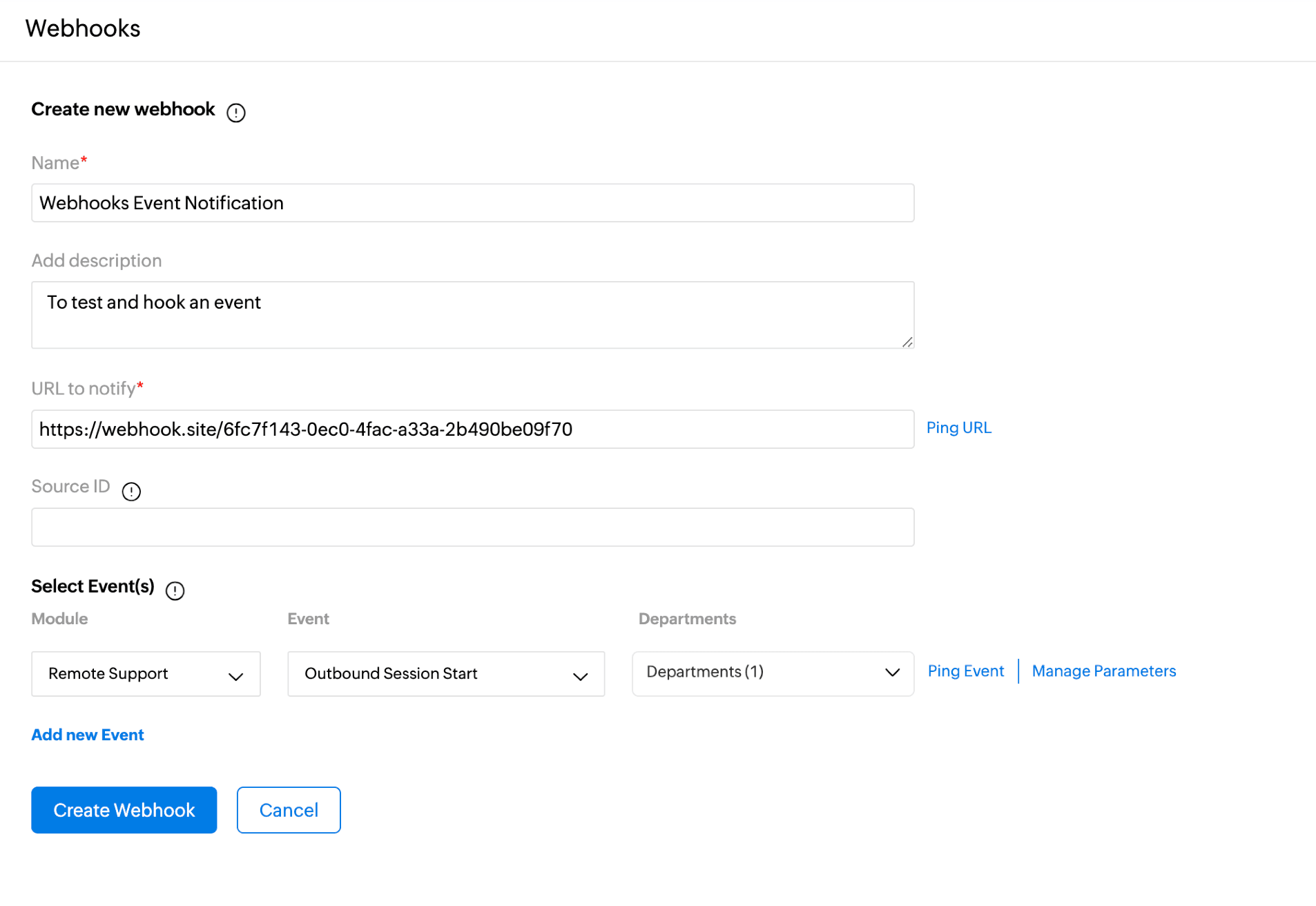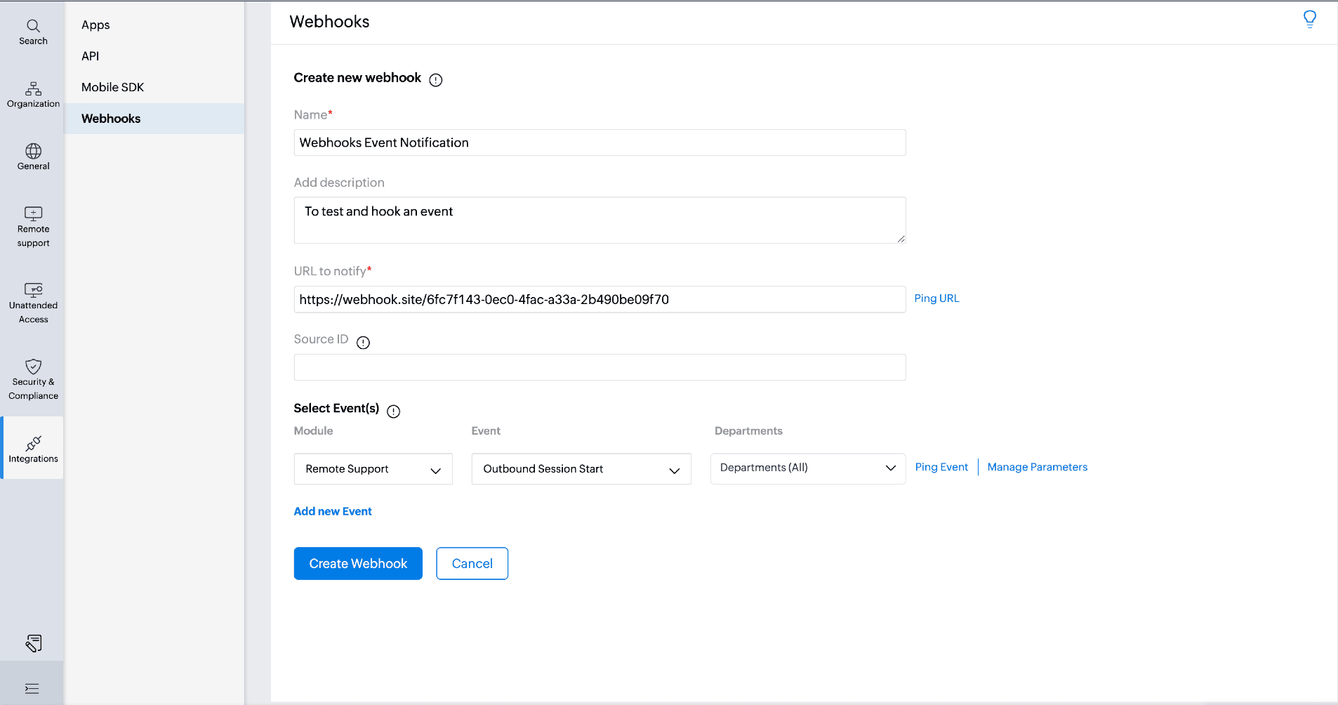 Webhook is an advanced integration that allows notifications to be triggered to the configured URL when certain specified events are initiated - such as starting a remote session or screen share session. You can receive any number of events through a single callback URL. Webhook feature is supported in Zoho Assist Enterprise edition only.