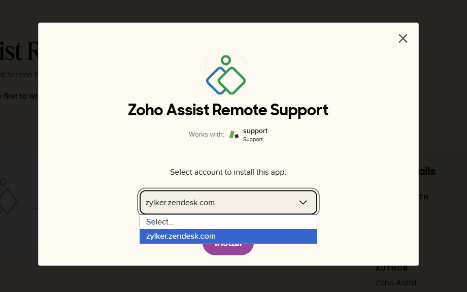 - Search for Zoho Assist – Remote Support App and click Install (if not installed).