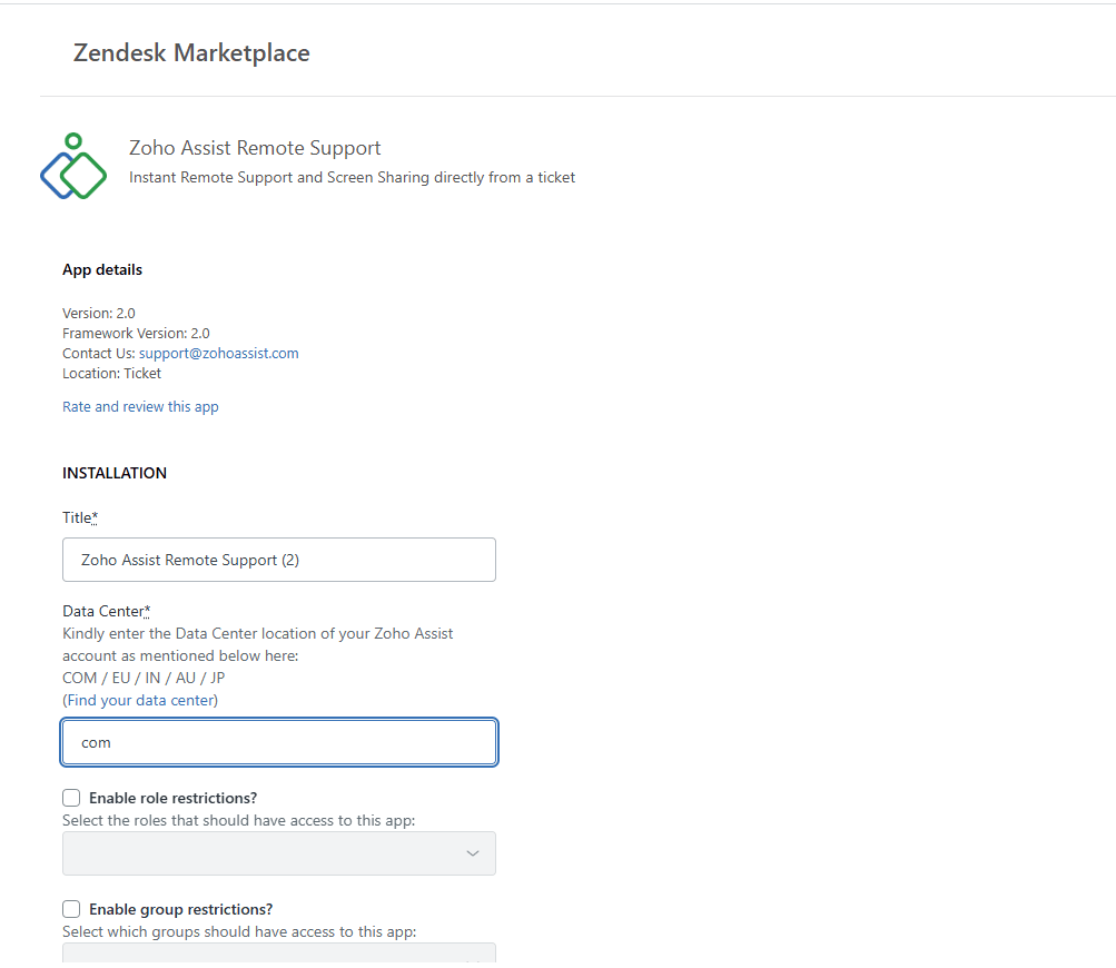 - After installation, Zoho Assist will be listed under Currently Installed Apps in Zendesk. You can also verify the installed app by visiting the Assist Settings > Integrations page.