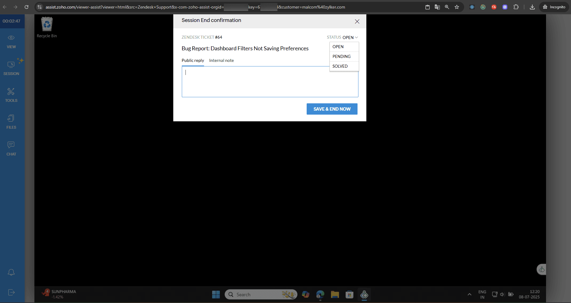 - You can add an internal session note or a public reply, then click Save & End Now to complete the process.