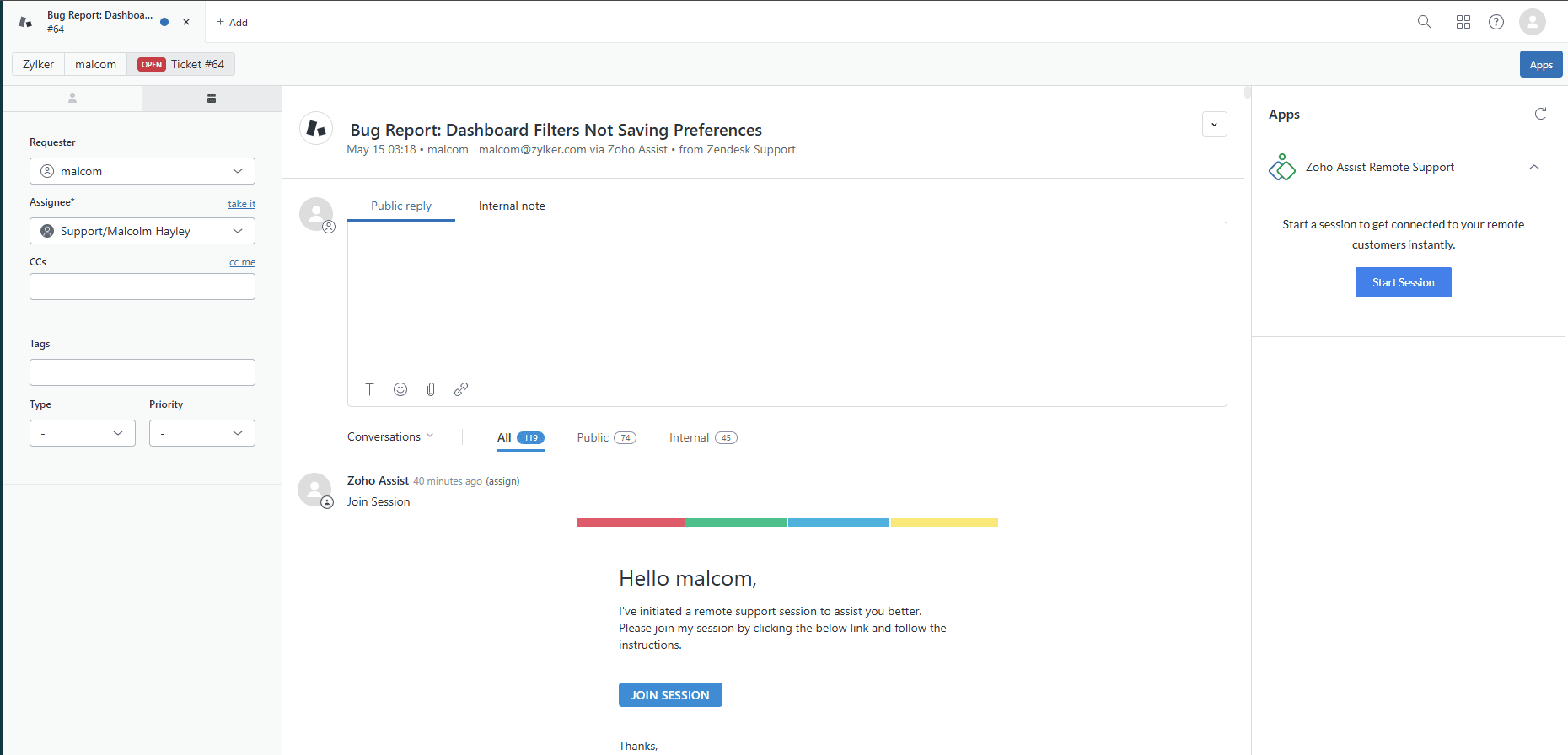 Integration of Zendesk with Zoho Assist enables you to initiate remote support and screen sharing sessions directly from Zendesk support tickets. Resolve every ticket and enhance your customer service by providing remote support to customers anywhere in the world.