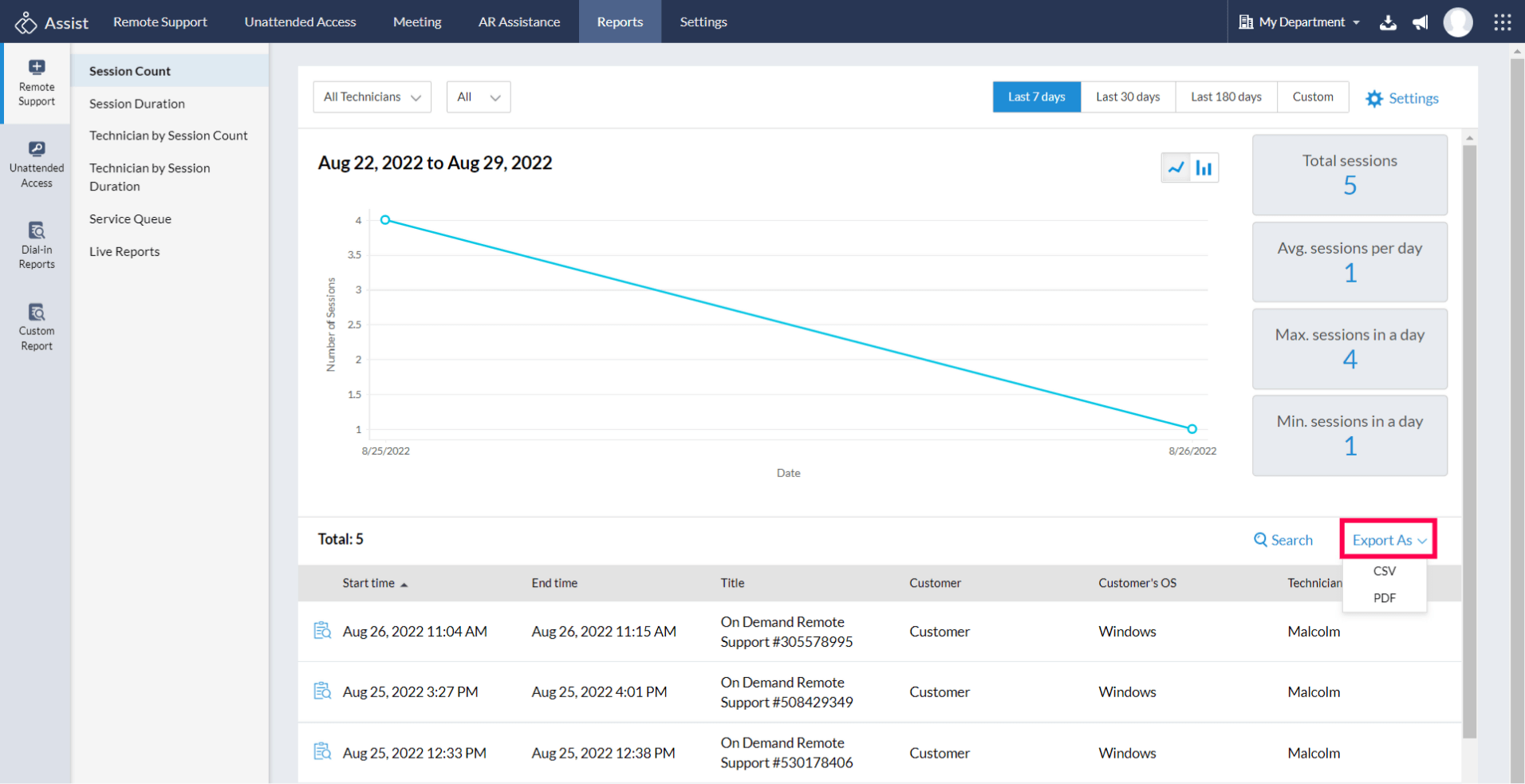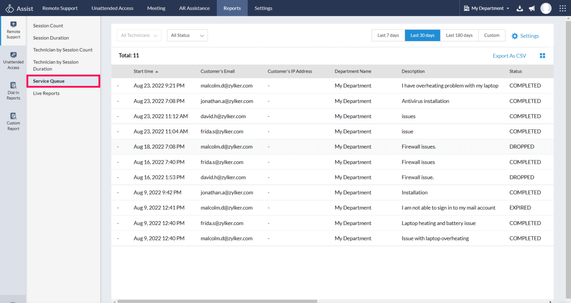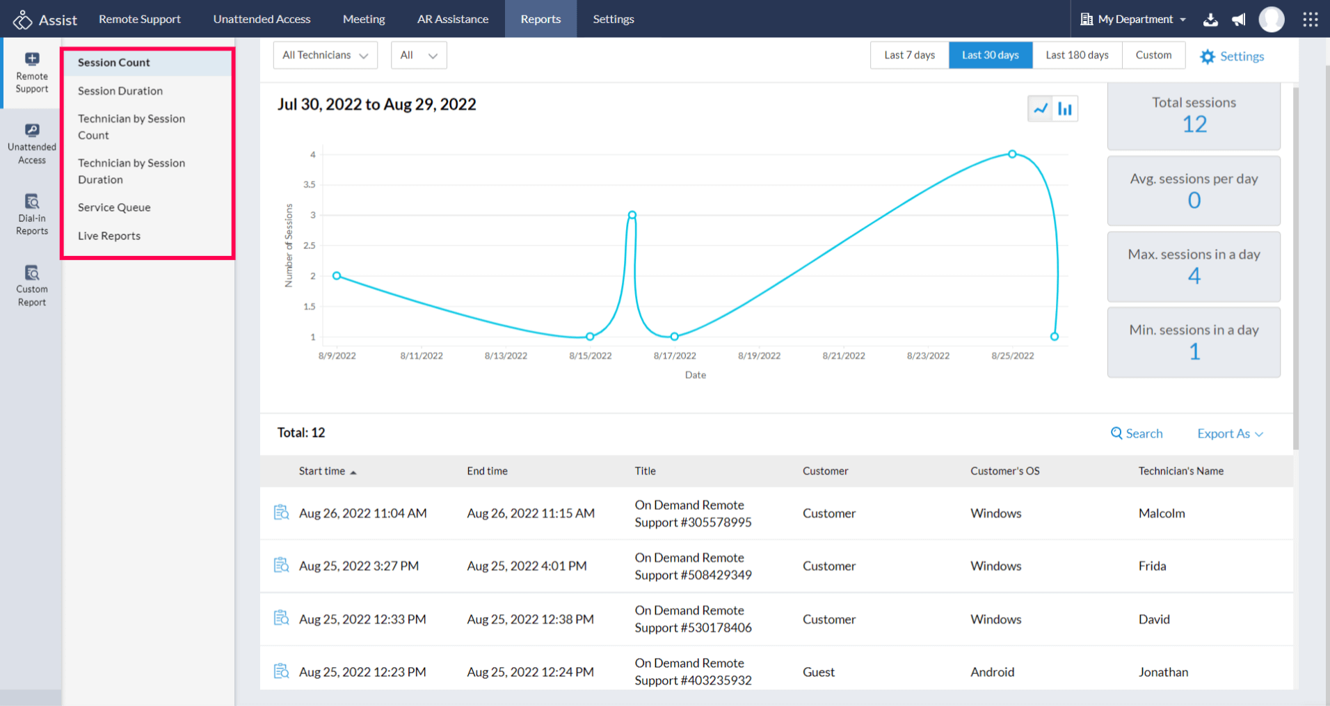 - Choose any one of the views segregated based on the session count, session duration, the technician and also view the status of your service queue requests from the left-hand sidebar.