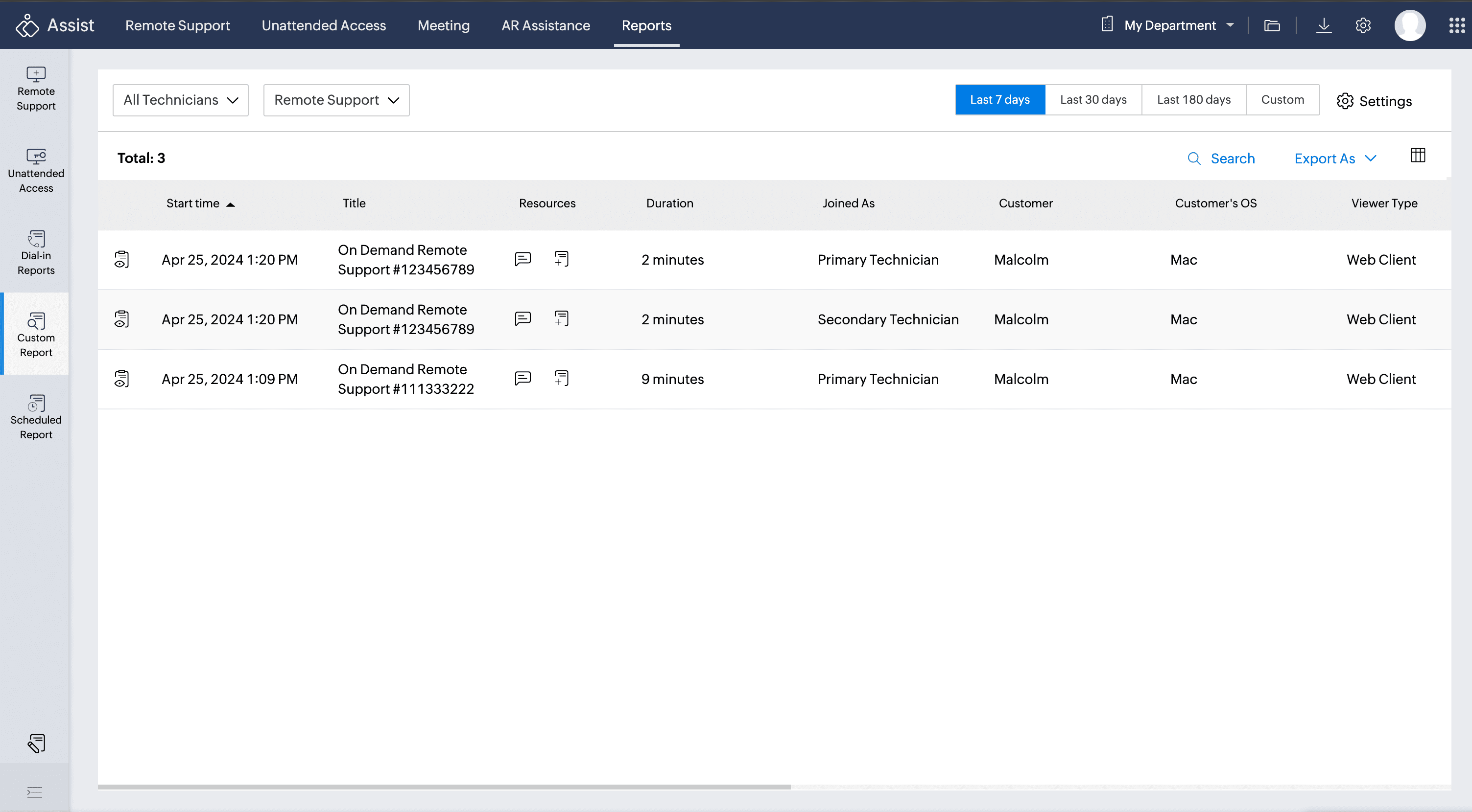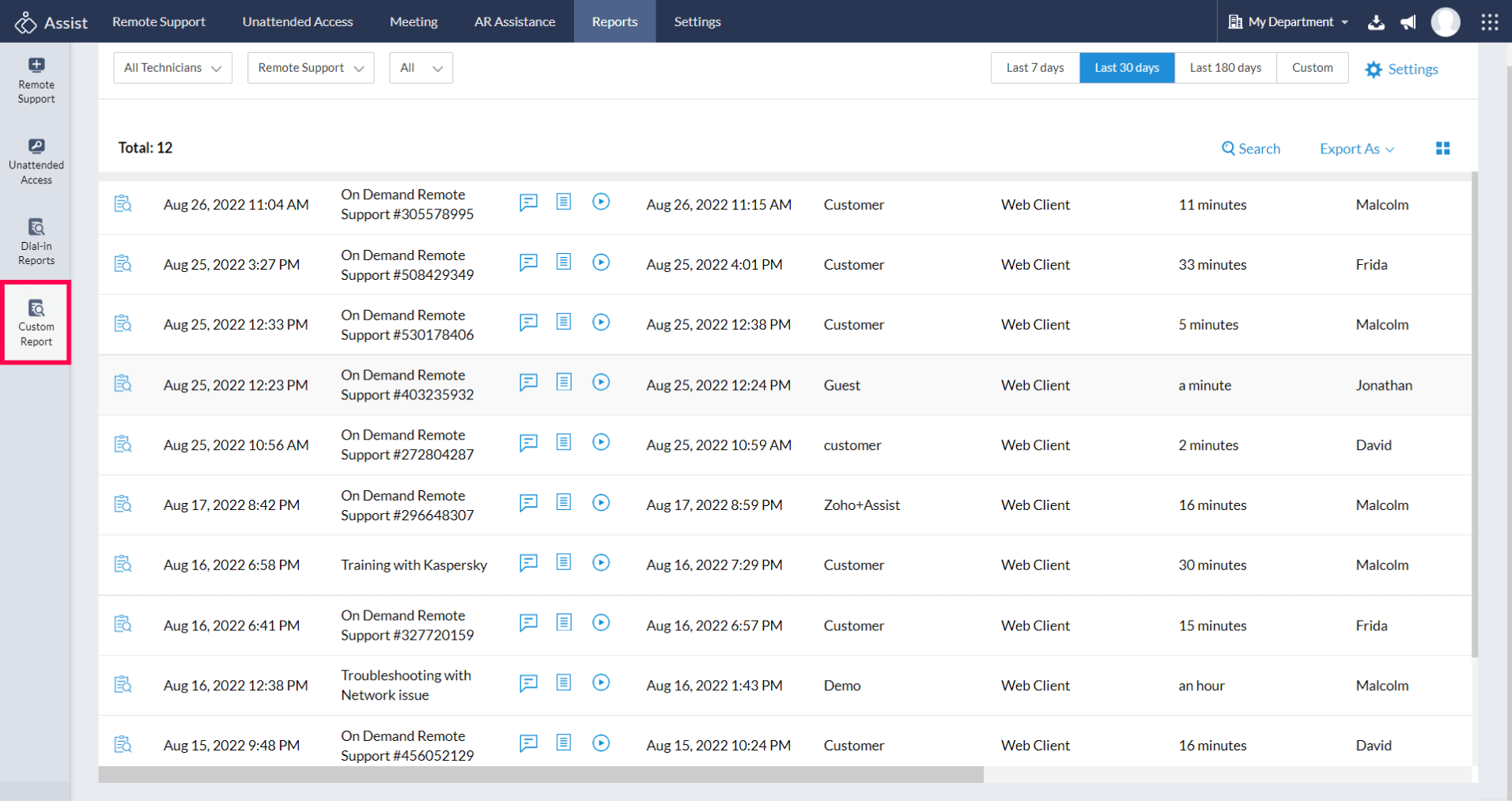 You can track your previous sessions with ease using Reports. You can choose from a wide range of custom views to visually analyze your remote support details better. View, analyze and download remote session details for sessions carried out over the past few months and more. You can drop out manual analysis and use our reports for better monitoring and planning.