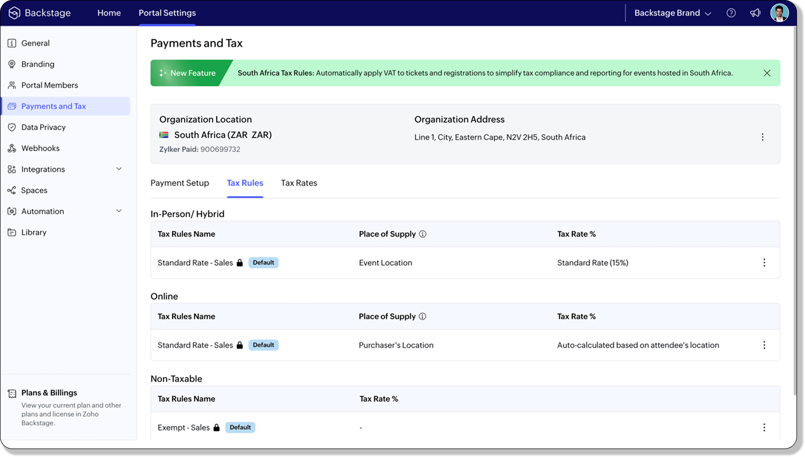 We’ve extended tax compliance to South Africa. Zoho Backstage automatically applies VAT rules based on your event type and organization location. With predefined rates, automated application for in-person, hybrid, and online events, and clear order summaries, managing transactions becomes simpler, more accurate, and fully compliant.