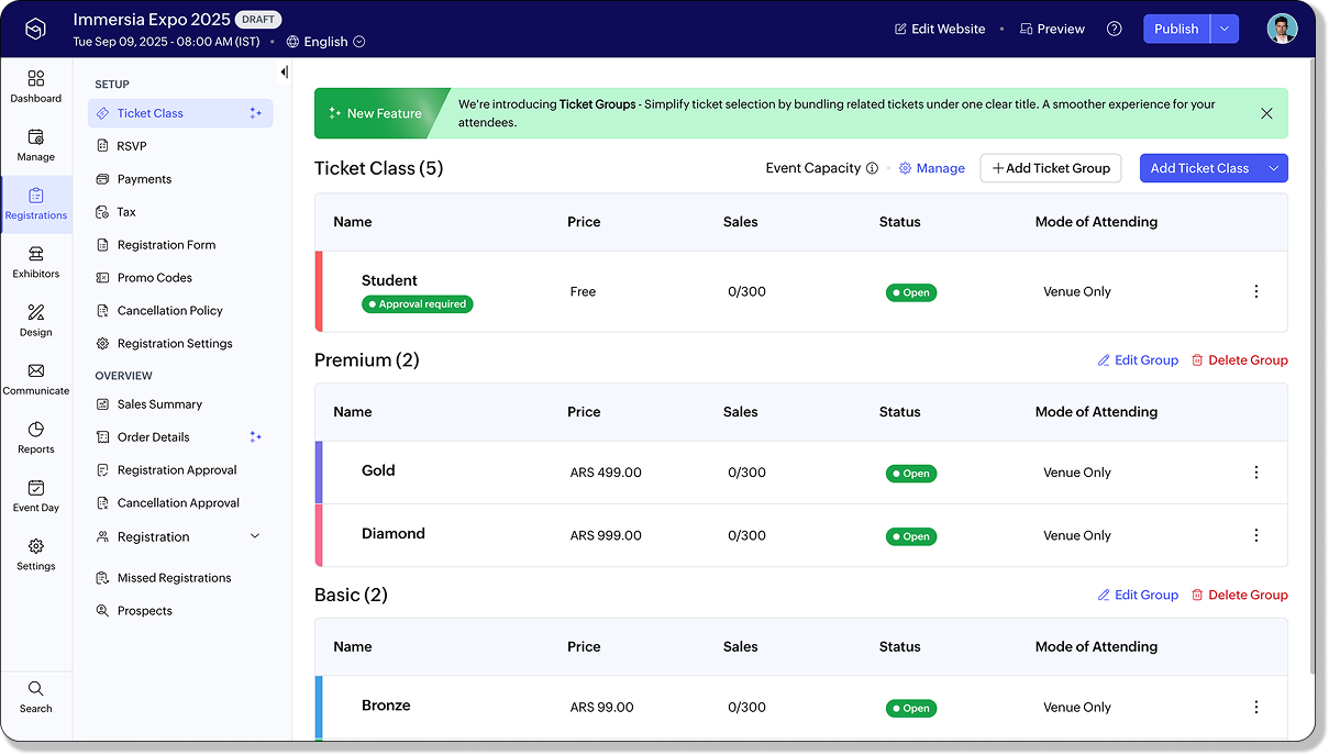 Group ticket classes in Zoho Backstage to create a cleaner, more structured registration flow. Whether it’s general admission, VIP, partner, or investor passes, grouping makes differences clearer for attendees while keeping management simple for organizers.