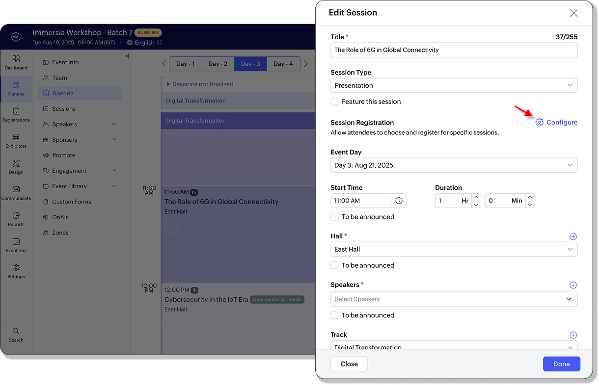 Keep speakers better informed by automatically including their session details in welcome emails and sending instant updates for any new or rescheduled sessions.