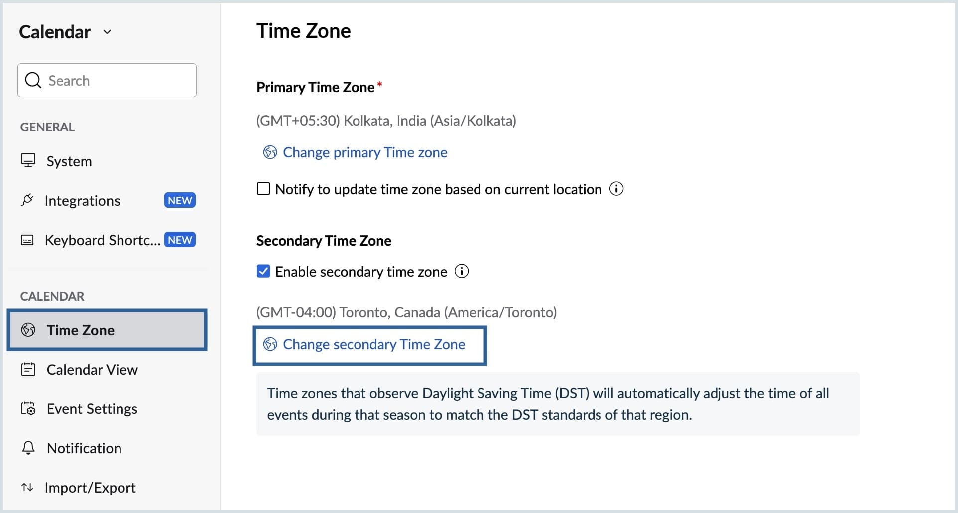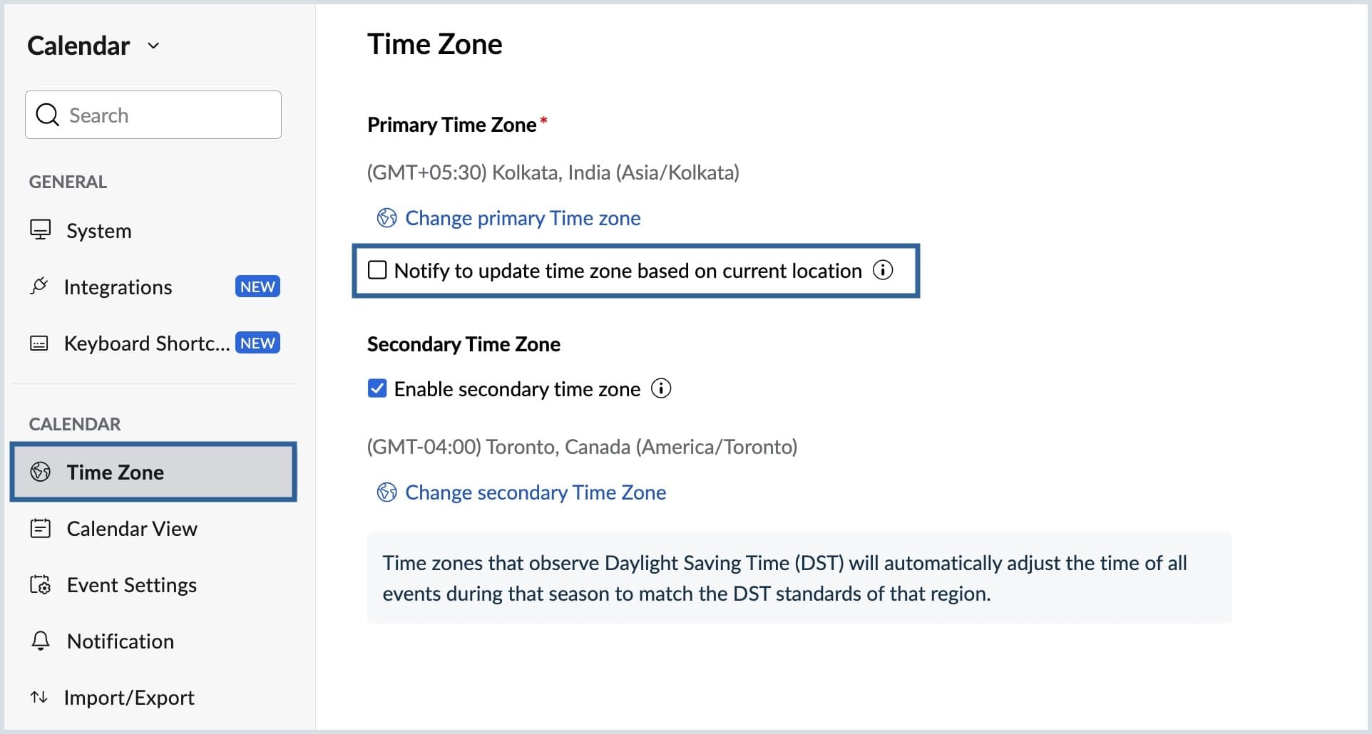 - If you travel frequently, you have the option to receive notifications when you're in a location different from your primary time zone. To enable this, click on the Notify to update time zone based on your current location checkbox.
