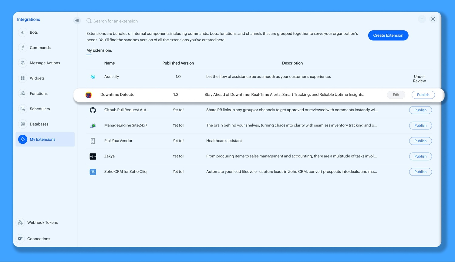 Extensions are bundles of practicable code integrations, containing commands, bots, message actions, functions, schedulers and databases combined together to suit your client or user requirements. Extensions created by you are listed under the My Extensions section. The extensions installed from Zoho Marketplace are listed under the Installed Extensions section.