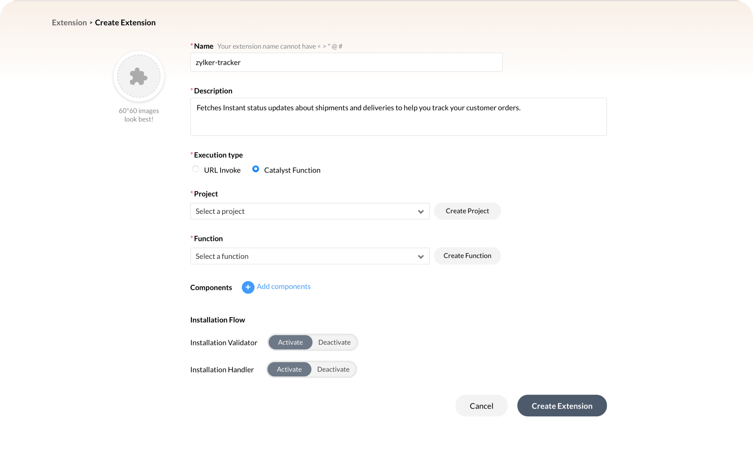 Catalyst Integration in Cliq allows you to integrate Cliq components with Catalyst for custom-built coding functions that contain the intense business logic of a Cliq Extension. By integrating catalyst with Cliq, you can code your business logic of any development platform that is supported via Catalyst, in Java or Node.js platform. When a particular feature is accessed in the external service, Catalyst automatically invokes the execution of the Integration function coded in Catalyst through an HTTP call.