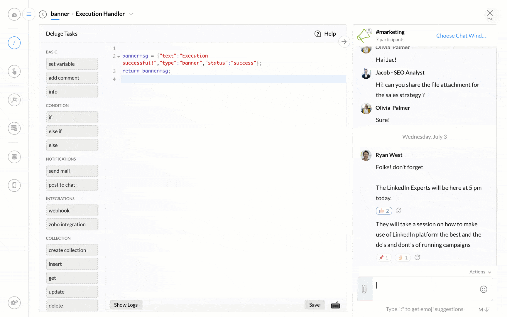 Let's take a simple example of showing a banner message to the user when an internal component is triggered on the Cliq platform.