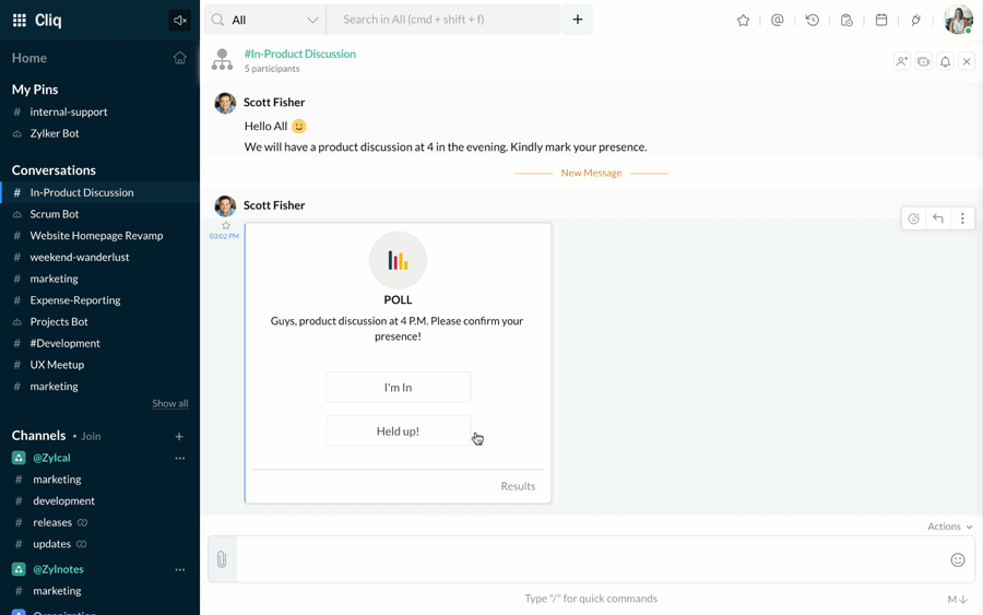 Let us assume that your team has planned to meet for a product discussion. But before you decide on the meeting venue and other things, it is important to take the number of head counts. For this, create a simple /poll command that will record the responses from the user and store it in a database. When the user clicks on a button for example (Available/Not Available) a banner message is displayed to the user.
