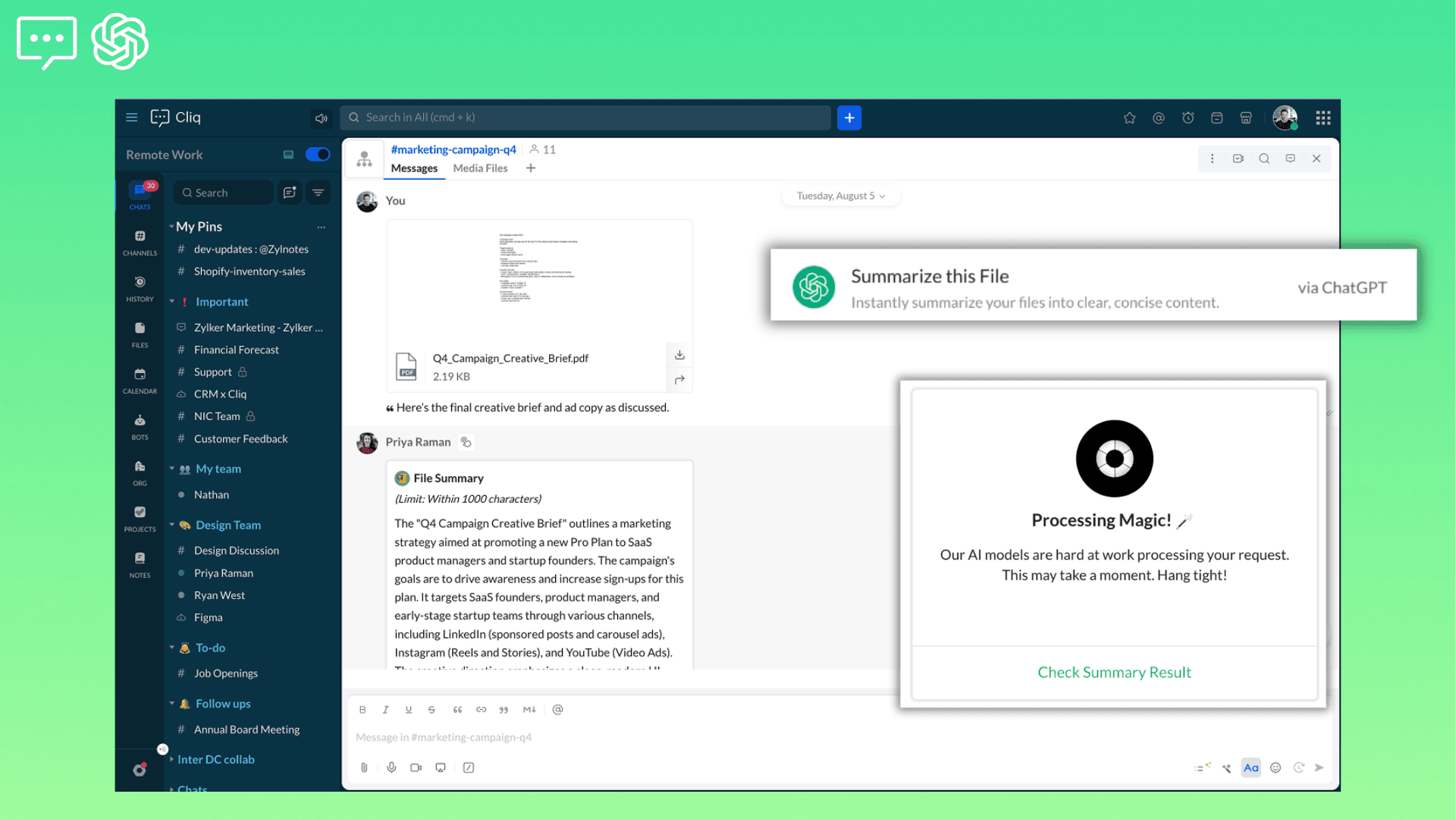 IntegrationsGet a quick snapshot of any file shared in Zoho Cliq with the "Summarize this file" action in the ChatGPT extension.