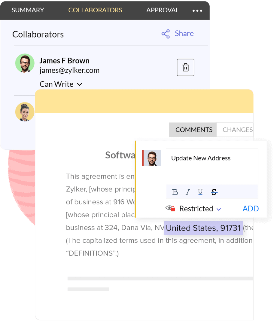 When drafting contracts, contract owners can choose a template and make minor tweaks as needed. If they need to add or remove clauses from the document, the advanced document assembly feature makes it a breeze. To further improve the contract drafting process, team members can collaborate in real time based on their permissions. With all of these features in one place, contract drafting becomes faster, easier, and more efficient. This also reduces legal dependency.