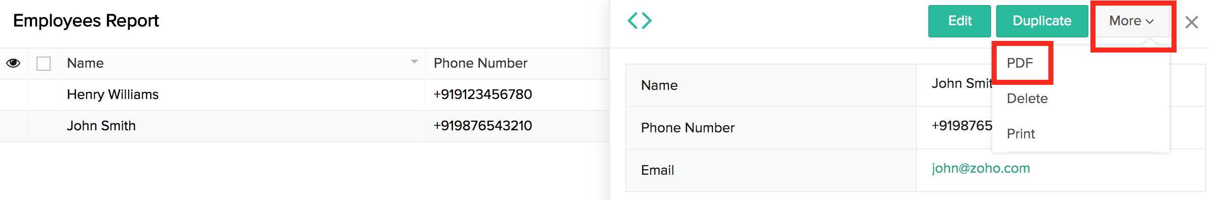 - Click the record that the template has to be exported for as pdf.