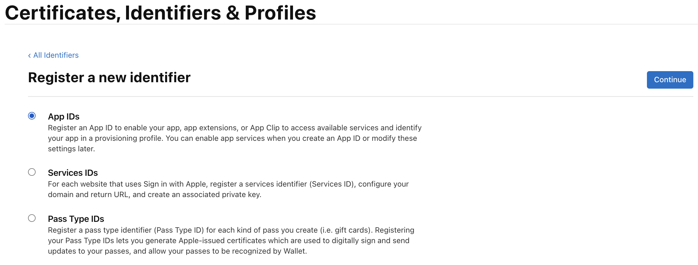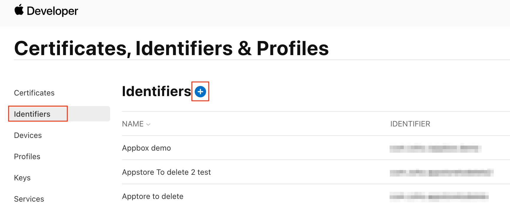 - In the Certificates, Identifiers & Profiles page, choose Identifiers from the side navigation and click the blue plus icon next to Identifiers.