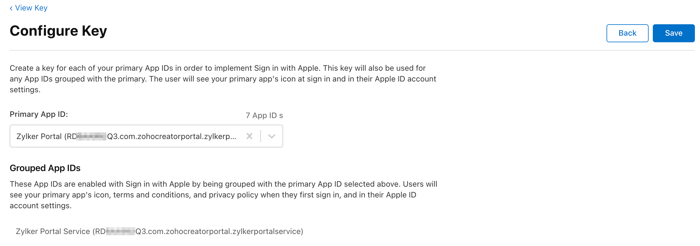 - In the Configure Key tab, select your primary App ID. Then click Save.